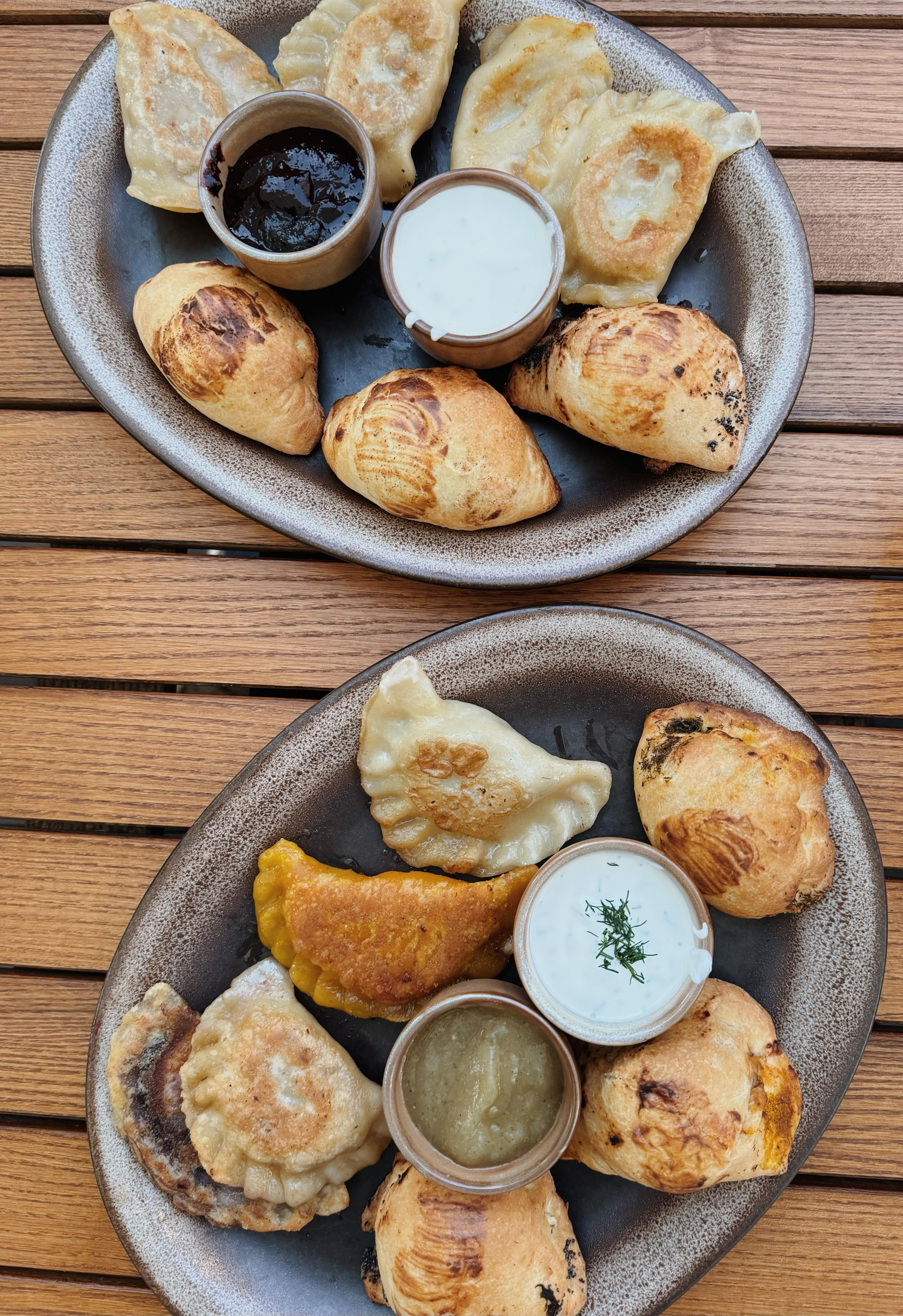 Combination of oven baked and traditional (fried) stuffed with beef, spinach and cheese, vegan and sweet with garlic and apple sauce. Restaurant called Pieorgania (a chain in Poland).