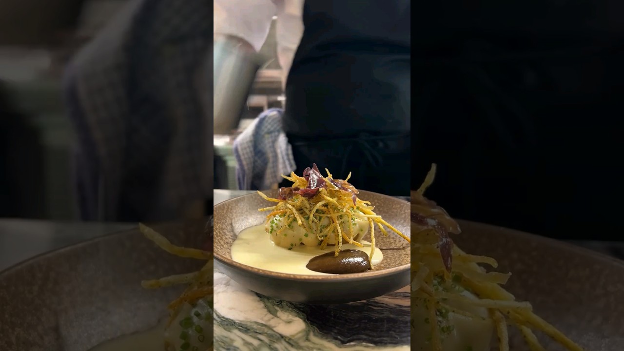 this is how we make our baked potato with cheese sauce We Begin by processing Cypress potatoes washing and trimming each side to create a flat surface portion potatoes are then submerged in melted butter and cooked until tender for the liquid cheese sauce we heat water milk mustard with a tapioca starch and Blitz to remove any lump next we make a r cooking to achieve a Sandy consistency before slowly pouring in our milk mixture and stirring continuously finally we remove from the heat add grated Linka poacha double cream and mix well until it MiFi for our shoe string potato garnish we slic potato into to match sticks on a mandlin along with off cuts from the fondant potato these are rinsed and then fried until crispy and dusted with seaweed seasoning for service we start our potatoes on the pler until caramelized on both sides before placing in the oven we top this with our cheese sauce toasting under the salamander finally we top our potato with fresh chives Sho string fries pickled D serving with Walnut ketchup and a comu butter emulsion