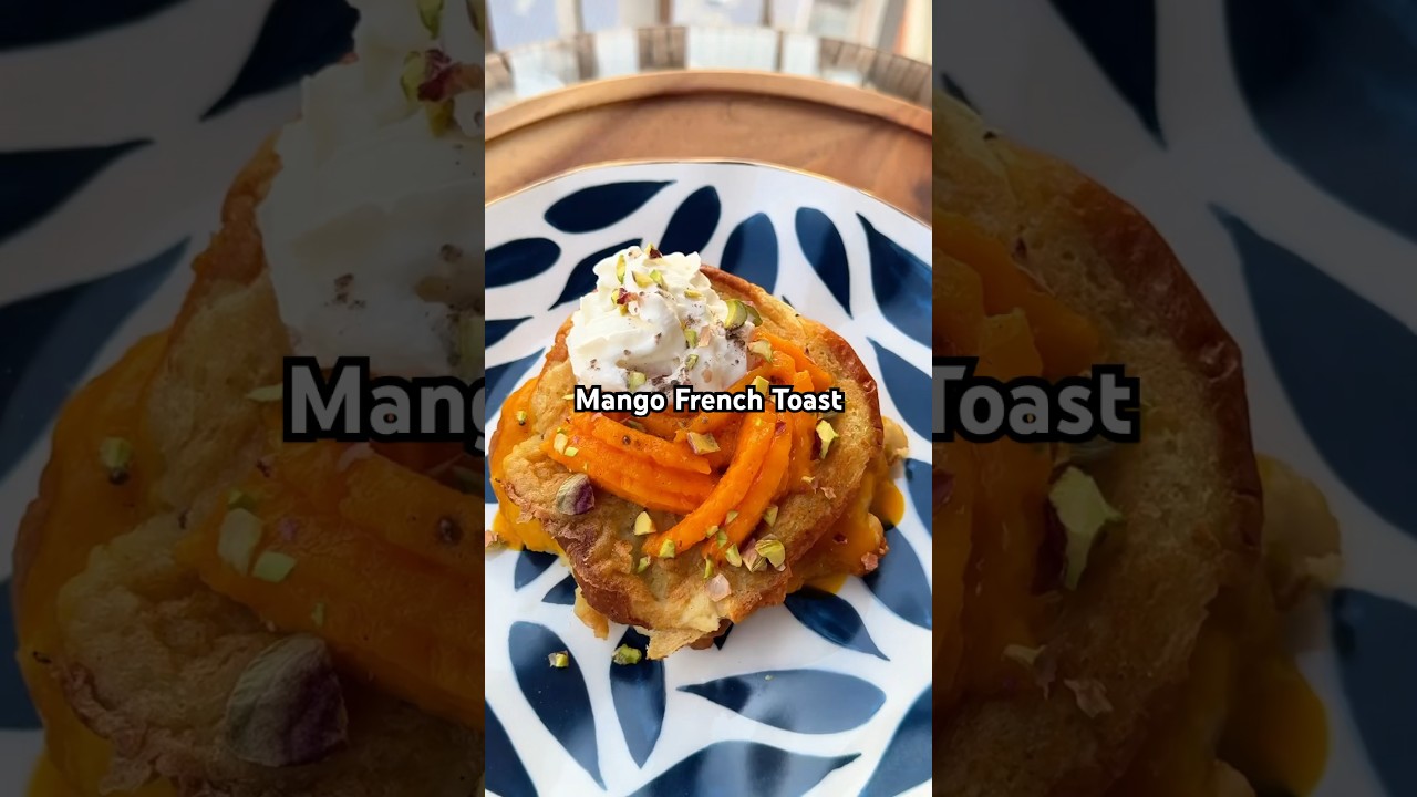 we’re making quer mango French toast and Ed to my childhood and Indian summers it is eggless delicately spiced with cardamom and made with deliciously juicy ripe quer mangoes from India layer it with some fresh mango puree top it off with mangoes whipped cream and crushed pistachios and enjoy