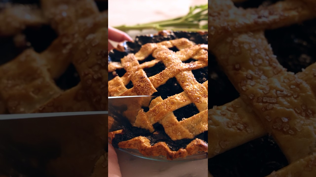 this incredible blueberry pie is so delicious and packed with flavor it’s just hard to beat blueberries brightened with lemon juice sweetened with sugar get tossed together and the secret to this is a fresh Butter Crust so crisp and amazing dot butter on top for extra richness then cut your lattice this is so easy to do and I love the way it looks give it a pinch and then we’re going to finish this off with a nice eggwash so it’s all shiny and golden brown top with some sanding sugar and just like that it’s ready to go into the oven until bubbling and golden let it cool give it a slice and you’re ready to enjoy happy baking