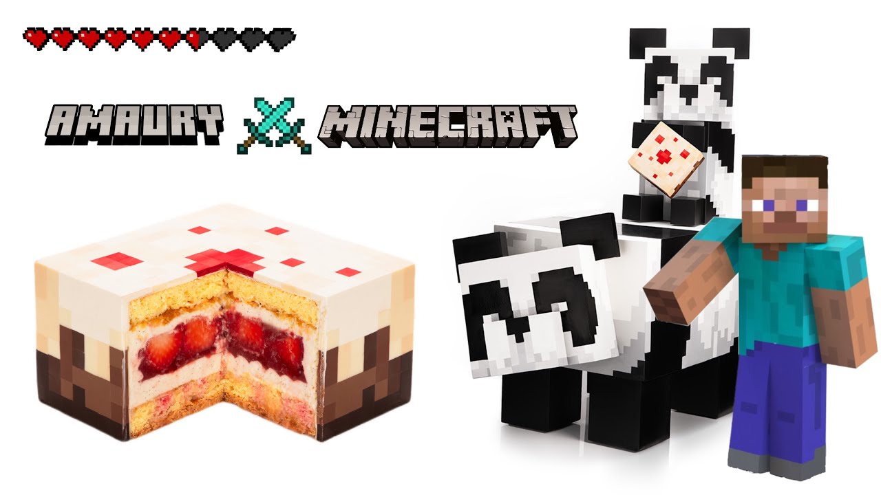 This is a Minecraft panda and it’s baby indulging a pixel-perfect Minecraft cake, which conceals a delectable strawberry fraisier on the inside. This sweet masterpiece includes a crunchy vanilla streusel base, layers of moist vanilla and almond sponge cake, all encasing a smooth vanilla mascarpone cream mousse, fresh diced strawberries, and a luscious strawberry coulis. It was fun Blending the worlds of gaming and gourmet into a unique experience!”