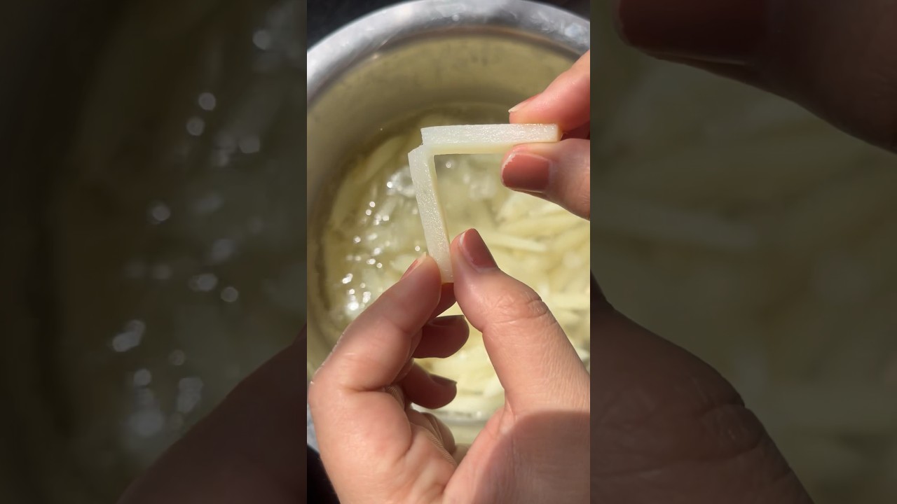 लेट्स मेक फ्रेंच फ्राइस दैट टू विदाउट यूजिंग कॉर्न फ्लर इसके लिए आलू को कट कर लेंगे कुछ इस तरीके से और दो से तीन बार पानी से वॉश कर लेंगे जब तक कि पानी क्लियर ना निकले अब एक बर्तन में पानी के साथ नमक डालकर आलू को गर्म कर लेंगे हाई फ्लेम में बेसिकली आलू को हम स्टीप कर लेंगे ताकि आलू का एक्स्ट्रा स्टार्ज निकल जाए आलू को मैंने 75 डिग्री में गर्म किया है अब फिर से मैंने एक फ्रेश पानी में आलू को फिर से बॉईल किया है जब तक कि आलू सही से पक ना जाए जब आलू सही से पक जाए तो उसको एक क्लॉथ में ड्राई करने के लिए रख देना है और जब आलू अच्छे से ड्राई हो जाए तब उसको गर्म ऑयल में सेमी फ्राई कर लेंगे और फ्रीज कर लेंगे सिक्स टू सेन आर और जब भी फ्रेंच फ्राइस खाने का मन किया डायरेक्ट फ्रीजर से फ्राइज निकाल करर फ्राई कर लेंगे और ब्लैक पेपर और नमक स्प्रिंकल करके इसको सर्व करेंगे इस प्रोसेस से फ्राइज बाहर से क्रिस्पी और अंदर से फ्लफी बनते हैं एक बार यह प्रोसेस आप भी जरूर ट्राई करना