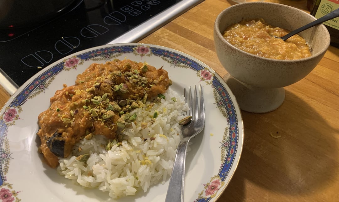 Aubergine au four, petits pois, pommes de terre, pâte de curry Patak’s, yaourt, tomates fraîche et en concentré, pistaches. Le dahl c’est oignons et tomates sautés au curry, incorporé dans lentilles corail à l’ail. L’assiette était trop généreuse, ça fera des restes !