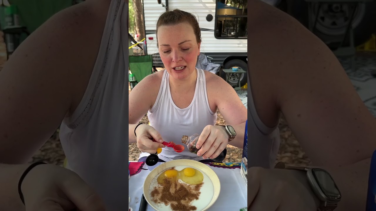 hey everybody it’s Marlo Hannah and I are camping at jle island and I’m about to make us some breakfast I’m going to make a French toast fry a few days ago I made some finger sandwiches and I was like ridiculously upset about having to throw away all the bread and crust so I decided we needed to make French toast with those leftovers so two eggs and a half a cup of milk so far one whole teaspoon of cinnamon two teaspoon of vanilla I want to save some of this at least for sprinkling on top when it’s done all right now I’m going to it going to give this a good mix and get all this kind of coated with our stuff let us know in the comments how do you make your French toast sprinkled some brown sugar on mine and then put just a little bit of maple syrup good oh good