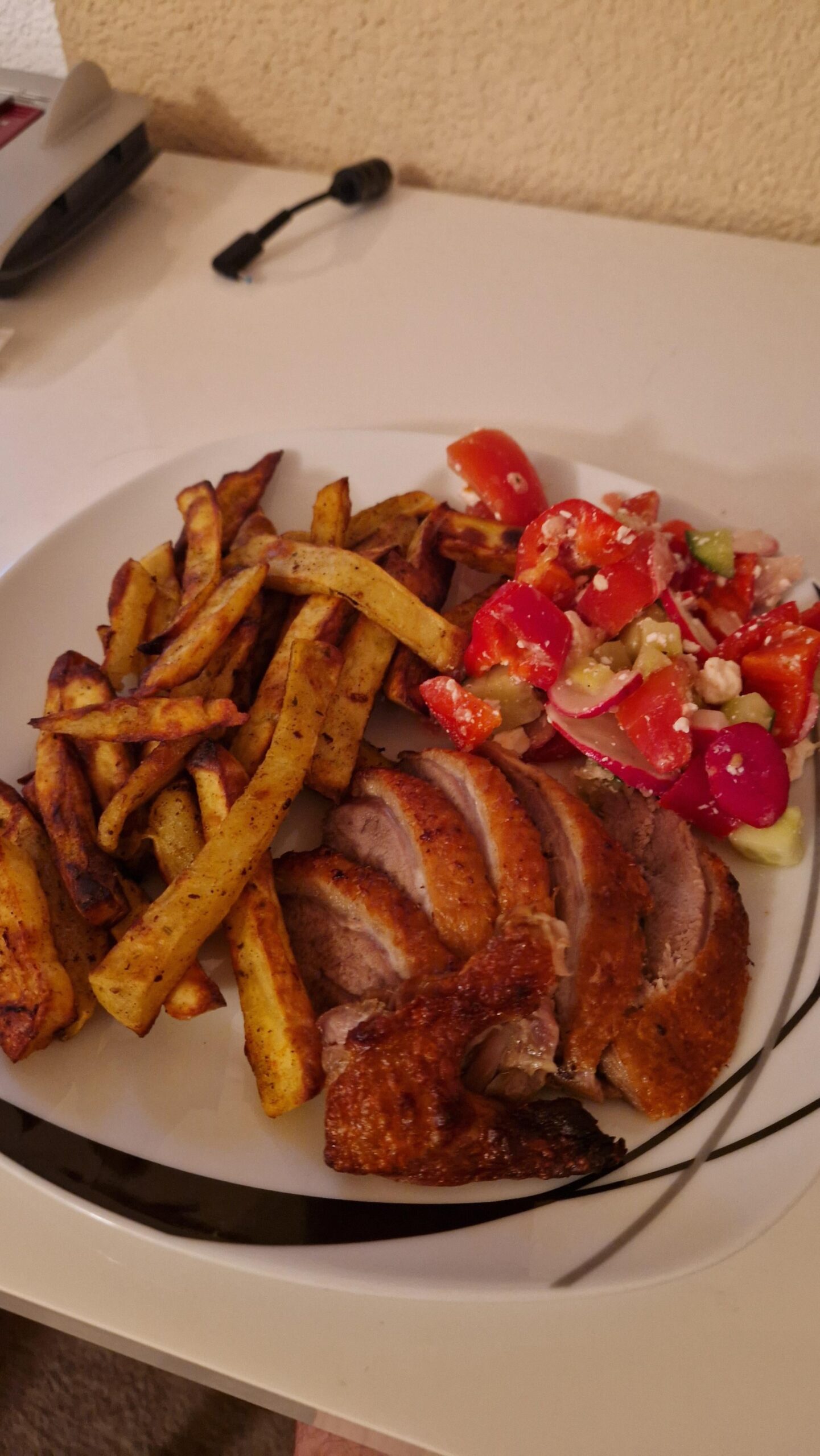 Roasted Duck and Oven Potatoes with a side salad (cucumber, tomate, radish, paprika and feta cheese) Would rate 8/10 Potatoes git a little to chared:)by LoneGranadier europeEurope EatsWrite A CommentYou must be logged in to post a comment.