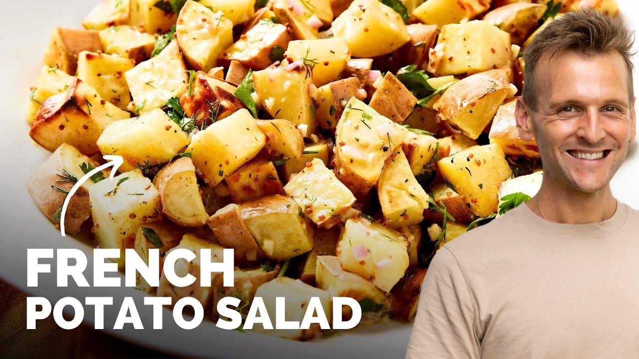 it is summer and that means it’s potato salad season so to freshen it up I’m doing a French style potato salad bright flavors really simple preparation all with a secret ingredient in this potato I think it’s going to surprise you so let’s dig in and make it this is a French style potato salad and what that means is it’s going to be a beautiful vinegret on it that is bright that is cheery dare I say kind of mustard-based but so good as opposed to a traditional maybe American style potato salad that has a more creamy dressing on it which I have a great recipe for on my website if you want to go check that out it is such a good one but this is to me every time I make this it is gone in seconds I get so many compliments on it because it just has really good flavors and how we’re going to switch it up is with the potato you can use any other Potato Yukon Gold would be great with this I am using a white sweet potato and I think that is essential for this because what it is is it looks like a white potato it has a high starch content like a traditional baking potato would but it has that sweeter Edge to it and it has a little bit of that sweet potato flavor so to me when you are mixing this in with that kind of vinegret we’re going to make there is just nothing compared to this now I live in Iowa okay and we don’t always have everything in Iowa but I have a couple different grocery stores that have wi sweet potatoes and so if that means I can find them I’m pretty sure you can too because if we have them usually everyone else does I I don’t like to say that everything comes here last but it might so I have grown white sweet potatoes in in the past they’re a pretty easy one to grow but they’re also pretty easy to find and what I love about them is that beautiful sweetness that we love in any potato especially a sweet potato and the flavor and so to me it mixes so well with this potato Sal now what I’m doing is I’m going to start instead of boiling them in water which I think kind of dilutes the flavor adds water don’t want to do that I want to roast them you know I love to roast anything what this is going to do is heighten the flavor it’s going to add that beautiful kind of caramelized flavor to them and really bring out a much better quality so what I want to do is toss them with this olive oil which I think is essential to make sure they’re well coated so they roast well I spread them out into an even layer I you can see I kept them somewhat big I’m going to cut this one I like to have them about you know half to 3/4 maybe sometimes sometimes an inch in size I like a nice heft to the potato here now what I’m going to do is I wash my hands I’m going to Salt and Pepper them well so this is our first layer of seasoning that we have the ability to do so obviously the dressing the vinegar we’re going to create is going to have seasoning in it too but this is going to help them have flavor right in the beginning and that to me is essential so I’m sprinkling that over then I have some fresh Cracked Pepper here and I’m going to sprinkle that this is just think like this would be a side dish you could get ready on a weekday night or something like that but we’re going to dress it up even further make it into really what is a summery dish perfect for going to picnic you know what’s great about this one since it’s not mayonnaise based you don’t have to quite worry about keeping it quite as chilled as a mayonnaise based one so winwin if you ask me so we’re going to throw this now right into the oven high heat I’m going to let it roast until it’s nice and browned the potatoes are done you can see how I can make a little bit of brown on them they still hold their shape really well which is what I want to they’re just perfect they’re creamy inside sweet potatoes are magical and these white sweet potatoes to me are just the best to keep on hand so I’m chopping up Garlic mincing it and it takes a good amount of garlic cuz that’s a lot of potatoes and you really want to exude that flavor so what I’m doing is making sure I add it all right in now can you use this always a question I get can you use the pre- chopped garlic in a jar you can I think it has sometimes an acrid flavor and really there’s something to me beautiful and organic about being able just to chop something up you know it takes a few seconds but I think it gets a better product in the end so I’m taking shallot now and I’m just chopping it mincing it slightly but not a fine mince so really what shallot is is a lighter onion flavor it’s a little bit sweeter and I think it’s essential when we’re using something like a nice vinegret with this it’s not near as astringent as even a red onion can be which you can know it’s just by the smell it’s just a nice lighter thing I’m going to add that in so already we have the base for pretty much what I would call a perfect vinegret so on top of this we have everything here that goes in now it’s going to look like a lot and it is a lot but it’s Dijon mustard so let’s talk about the two types of mustard we’re using as I grab the spoon here we have Dijon perfect flavor and it really adds kind of this creaminess without any type of cream or fat it just adds a nice kind of heft to it we’re going to cut that with some whole grain mustard which has a different flavor it’s completely different if you don’t like Deon whole grain is completely different so don’t get scared of that it’s so good and we’re going to add some white wine vinegar I usually make my own at home from leftover I know everyone’s always like leftover wine who has that I have some sometimes when I cook with it and I make vinegar with it just dump it into a bottle now I’m going to take my lemon it has a fresher flavor so we have two types of acidity we have that vinegar and we have fresh lemon juice which really kind of opens up a differ
