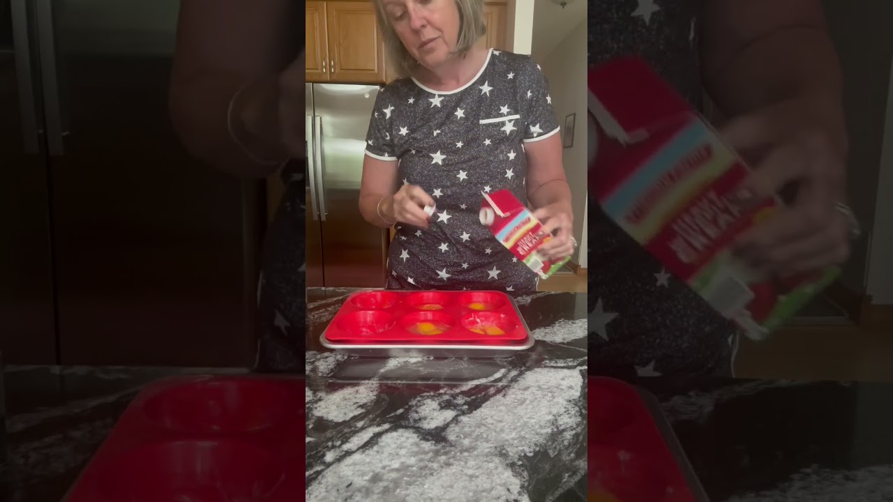 this is how I make my double baked french eggs I take a large jumbo siiz silicone muffin pan and I grease it with butter and then I put two cracked eggs into each muffin cup then I add about a tablespoon of heavy whipping cream to each muffin cup I top it with a little bit of salt I add smoked goua cheese you can use any kind of cheese but smoked gouda is perf perfect for this then I top it with some bacon crumbles bake in a preheated 375° oven for about 25 to 27 minutes [Music]