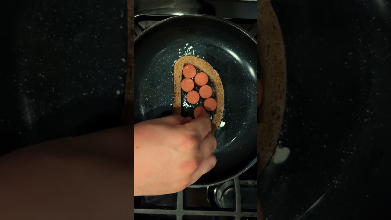 5. Add the sausages: Place the sausage slices on top of the egg mixture within the bread frame.