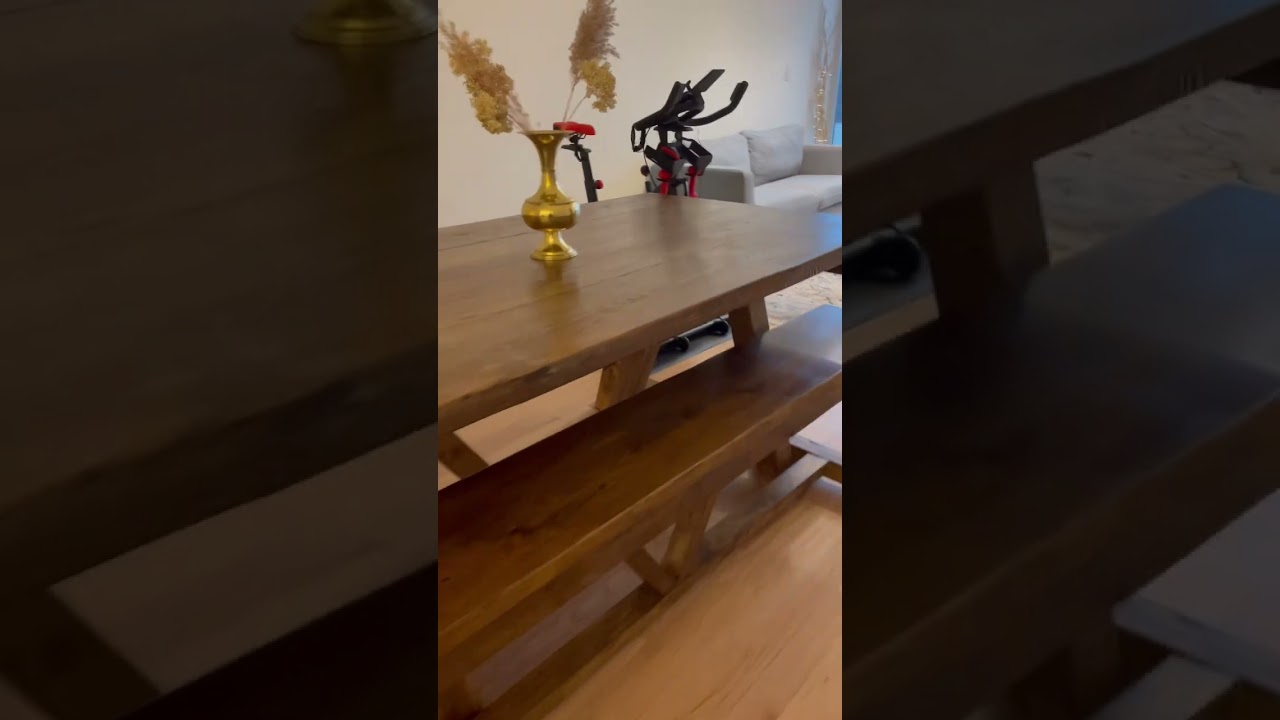 This is my indoor A frame dining table also known as the French beam dining table. The frames are made with reclaimed solid hardwood timbers of oaks and maples and the tops are made of Douglas Firs. You can have this table made any size and stained any colour all I need is your dimensions and I can give you a price. You can also visit me at my shop at 888 Danforth avenue and see for yourself the quality of wood that is s being used to make these one of a kind dining tables that I guarantee can not be found in any furniture retail store.