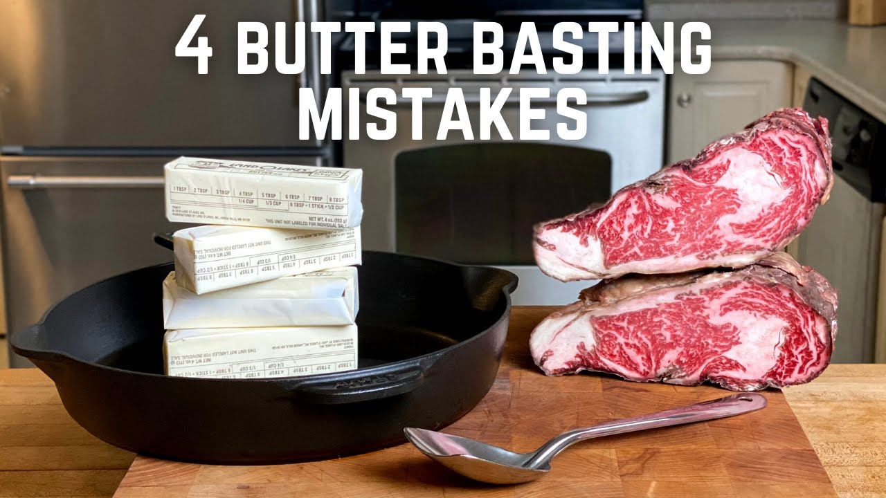 four butter-basting mistakes that you should stop making the first is adding the butter too soon we wanna make sure the crust is nearly set prior to basting to avoid a gray steak the next is adding butter to a pan that’s way too hot the butter will naturally cool down the pan but if it’s too hot it’ll burn tastes bitter and nobody wants to deal with those added consequences conversely avoid adding butter to a pan that’s not hot enough butter has water in it and if it’s not bubbling it’ll actually add moisture and ruin the crust next adding too little butter to the pan it’ll be more susceptible to burning and we want a lot of butter enveloping the steak helping it cook evenly you’re definitely not gonna eat all the butter but i would recommend a third to a half a stick sputtering and foaming for the best butter-basting results