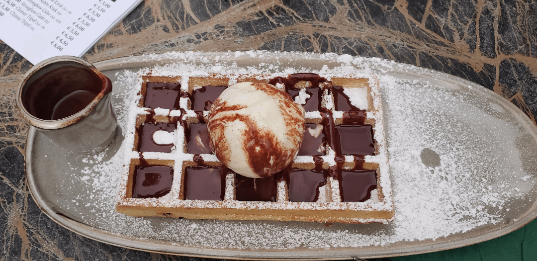 Belgian waffle with warm chocolate sauce in Bruges
