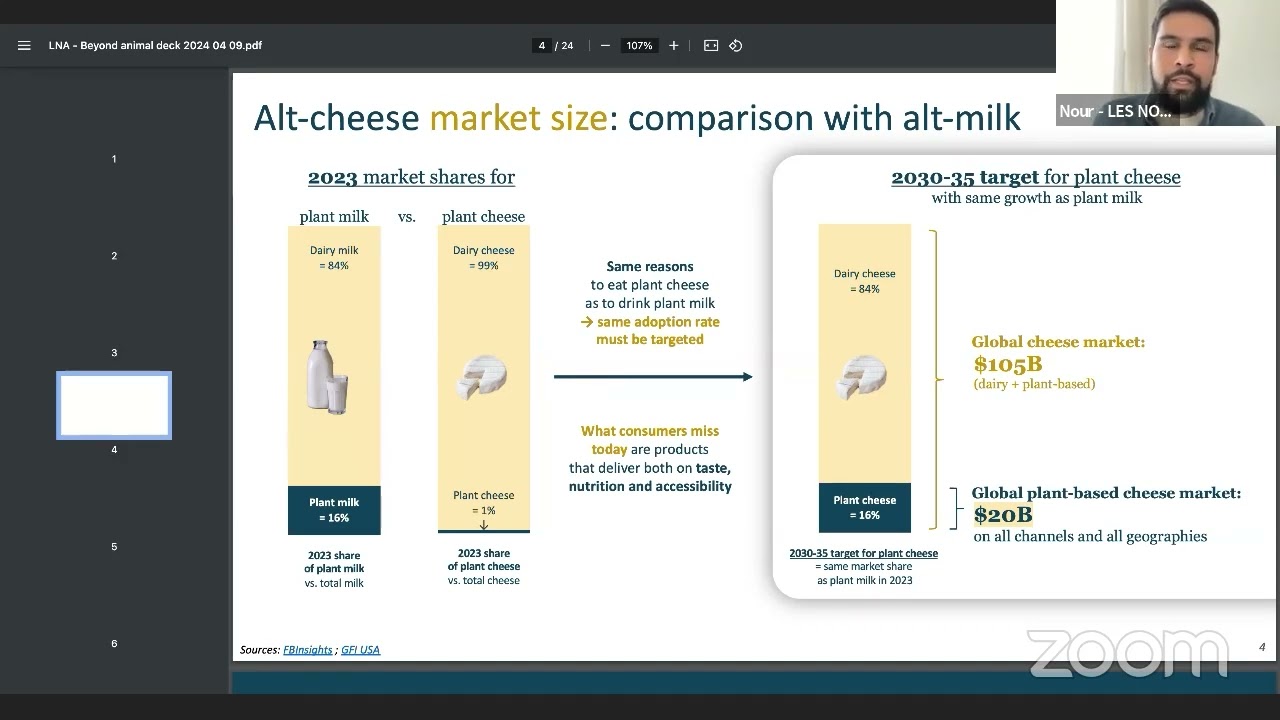 hi everyone so I’m new founder of um French vegan cheese company named Le thanks for um inviting us today and uh we are in this space um defining ourselves as uh technology and Industry expert ination to do uh plan based the space is crowded with many different companies with many different um Technologies uh to provide um consumers with Alder Solutions and I will explain how we focus on this technical aspect as well as the production um tools to um develop and scale up our products um first thing is that I would like to share a few figures about the market itself one important comparison that we can make is um the one with plant cheese and plant milk so today we know that overall um across 100 bottles of milk that are sold uh 16 are um already plantbased uh which is on a global scale uh quite important while um on the uh cheese industry we are hitting with difficulty a 1% um share which is very low and one thing is that the reason to switch from uh Dairy to pl-based milk are various could be uh eics uh some people are going for health uh do not want to eat dairy some are um allergic to Dairy anyway uh if we break down these uh incentives to switch from dairy plan based they are the same if we look at the cheese industry now why is the offer um so little and the market so little compared to with milk I think the reason the main reason is a lack of supply and that’s why uh we are dedicated to work on supplying products that are tasty that are good in terms of nutritional quality and value and that are accessible accessibility meaning both price as well as physical supply of the products meaning the production and the distributions that are very key to um all of this um um Market access and we see that if we make the calculation to compare uh the existing size of deres and the potential if we reach the same share as plant mil milk Global Market would be 20 billion which is huge and much higher than what it is today