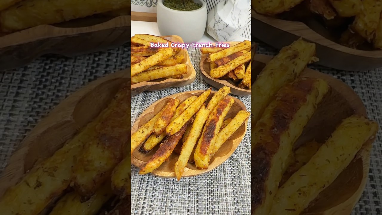 hello kay homemade baked french fries recipe you’ll say goodbye expensive McDonald or jell french fries all you need are some potatoes contain herbs and spices then peel and cut the potatoes into thin slices in a bowl let’s add 3 tbsp avocado oil 1 teaspoon paprika half teaspoon dried thyme 1 taspo dried parsley and salt and pepper to taste then add the fresh into a bowl mix them all together coat both sides picino fresh shreded cheese para crispy pop into the oven and bake until crispy golden brown oh they’re actually really crispy and so good herbs and spices for this recipe are just the right ingredients perfect