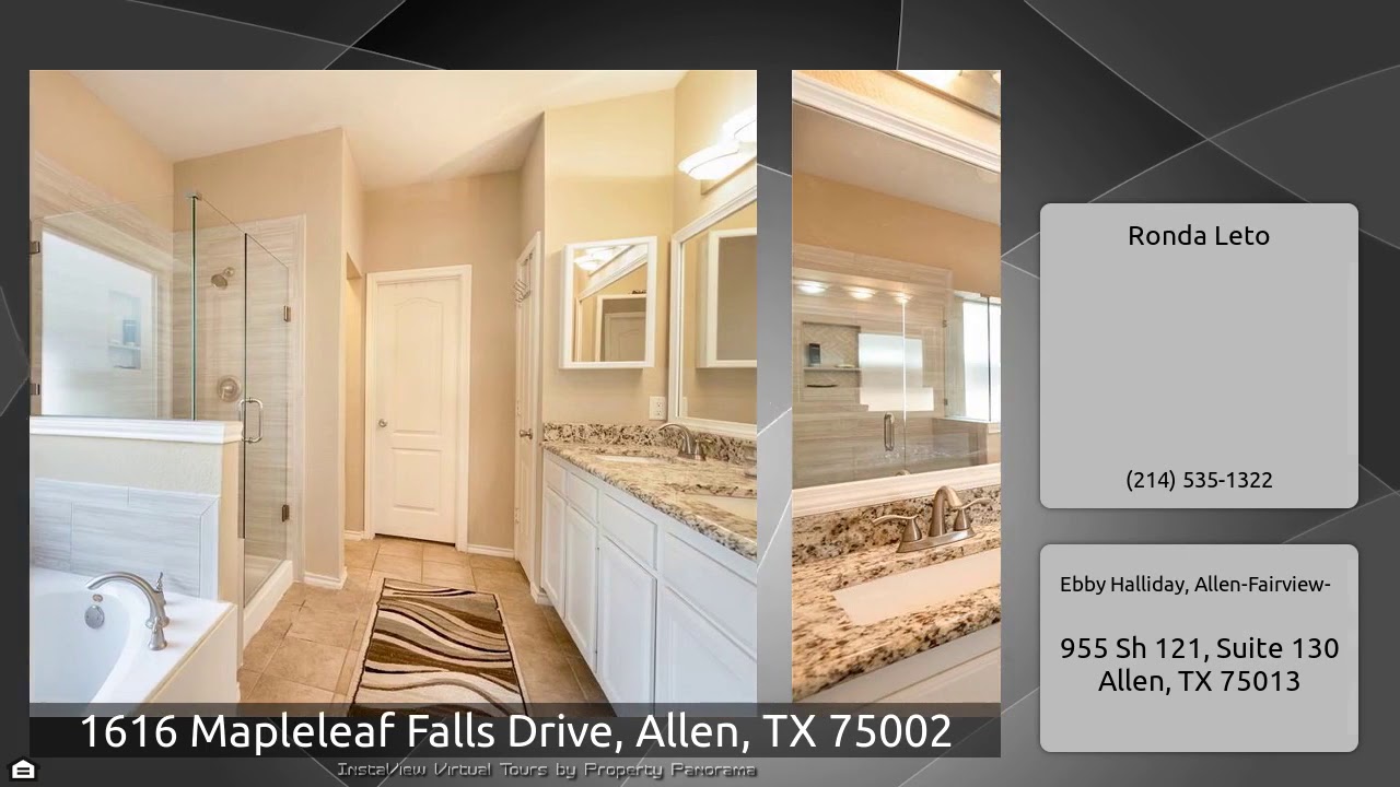 The Virtual Tour for the property at 1616 Mapleleaf Falls Drive, Allen, TX 75002 listed for $339,000: Other homes for sale by Ronda Leto of Ebby Halliday, Allen-Fairview-: Updated 4 bdrm home in popular Villages of Maxwell Creek! Extensive wood floors throughout most of the 1st floor. Entry opens to a dramatic staircase, separate dining area & private study with French doors. Spacious family room has wood floors & corner fireplace. Beautifully updated kitchen has rich granite counters, stainless steel appliances, tons of cabinets & planning desk. Huge 1st floor master has an updated bath …