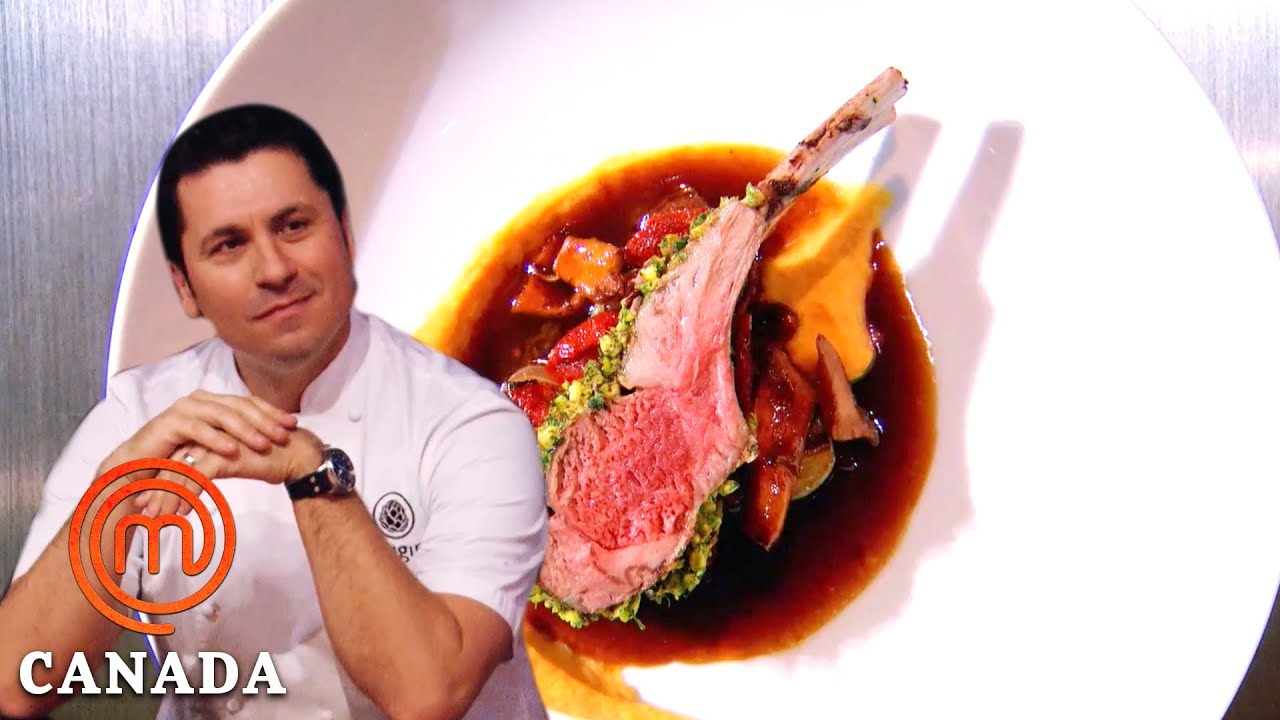 you may notice that there’s one Mystery Box up here with no one standing behind it that’s because we have invited a highly acclaimed Chef to cook alongside you we want this mystery Chef to inspire and motivate all of you the chef you’ll be cooking with has worked in some of the top restaurants on the planet please give a big MasterChef Canada welcome to [Music] Yours Truly [Applause] I’m inspired by who’s cooking with us Mr Claudio himself this is awesome today you will have the privilege of cooking right alongside our very own Chef Claudio aprile that looks way better on you than a sports jacket I might be old but I ain’t dead and that’s eye candy going on right up there just like the rest of you Claudio will have to prepare and serve a stunning MasterChef quality dish using only the ingredients under his mystery box at the end of the cook you will all have a chance to taste Claudio’s creation on the count of three you’re all gonna lift your boxes one two three lift in front of you you have a beautiful four bone rack of lamb pearl onions goat cheese sweet potatoes pistachios couscous Dijon mustard and a bottle of merlot home cooks and Chef you now have 60 Minutes to create one amazing restaurant quality dish the home cook that prepares the best dish will be invited into the pantry where they will receive a huge advantage that could alter the course of this competition are you ready your time quit Claudio is a world renowned chef so who thinks we should make this Mystery Box a little bit more challenging for him [Music] you have a lot of friends back there Claudio see if we can make things a little bit more interesting I’m going to take the goat cheese for one oh wow I’m not gonna be too cruel to you Claudio I’m Gonna Leave You half the pair let the games begin your time starts now I’ll shake it [Music] I’ve won back-to-back mystery boxes and I’m going for a third I’m sick of David winning Mystery Box challenges it’s time for a new person to be up there I hear you back there and sweet potato puree I can’t always be flying under the radar I need to win this I need to strike the right balance of sweet Savory so to go with the lamb I want to do a caramelized pear and sweet potato puree and I wouldn’t mind doing a better dish than Claudio [Music] I’m gonna do a ragu with some chanterelle mushrooms oven dried tomatoes pearl onions and crust by lamb and a little bit of pistachio some mint some basil some coriander all right Chef Claudio is a super impressive chef [Music] Chef Claudio is here it’s like I really got to bring my A-game having a poached pair with some goat cheese keep a very kind of Mediterranean style they pitfalled with lamb is how long it takes to cook you’ve got to sear it off in a pan and finish it off in the oven because it’s a fairly thick piece of meat hello you look beautiful as always thank you kindly what dish are you creating for us with a lamb I’m gonna do a pistachio encrusted rack of lamb oh I see you’ve got your lamb rack already crusted but the lamb is is raw any concerns that that might burn in the oven when you roast it I’m going to put on the bottom rack at around 350 and let it ride well you’re gonna have to keep a very close eye on that in the oven thank you chef thinking a little bit outside the box I’m doing a pan roasted lamb with boiled pistachio nuts and then pureed and a sweet potato puree having Claudio in the kitchen with us gives us added pressure love it hi Sabrina hi chef you almost seem too calm it’s as if you’re just you know cooking for a Tuesday night it’s funny that you say Tuesday night because Tuesday night’s my date night at home oh is that right so so I’m cooking for my love I’m cooking for my boyfriend he’s my number one fan tough being away for a while it’s so tough look forward to tasting it thank you chef I’m making a very complicated dish wine poached pear and that’s a couscous with celery carrots and I’m gonna deep fry some sweet potatoes I’ve never won a mystery box and I’d sort of like to win at least once 15 minutes let’s see minutes left I’m close to plating [Music] oh come on show off what’s he doing I think that this challenge is just too easy for Claudio how’s everyone doing Michael put a pistachio crust on his lamb just like you’ve done but he didn’t see her off his land at all wow I like the idea of cutting the lamp I think it’s smart of Jennifer to attempt this David is not doing a class with pistachio he’s actually making a puree which if he pulled off would be amazing 5 min 5 minutes I have to attend to my land guys foreign thing now is timing Gotta Wait Claudia was very wise to cook the lamb first because I see everyone here is probably a little bit worried about the Dinosaur Land between medium and medium rare is the absolute sweet point when serving lamb holy [ __ ] my Lamb’s underdone and I have like four minutes left not even buddy Raw I have to be an idiot and encrust the lamp first my heart is racing my mind is racing this is not good one minute yeah one minute left I’m gonna change this plate I want it to look Tighter and cleaner looks good hey no hey seven six five four three two one hands up [Music] Claudio please bring your dish up to the front would you describe your beautiful lamb dish please the Lamb with the crust of pistachio and then I took some sweet potatoes and I infused them with vanilla bean and finished it with a little bit of olive oil which had some Citrus in it the rest of you come up and taste what a Master Chef like Claudio does a beautiful rack of lamb it is a work of art Chef Claudio’s plate is delicious it’s mouth-watering pretty citrusy and it’s not a familiar flavor with lamb went so well together it’s gorgeous so this needs to be the standard you all work towards when you played anything please go back to your stations the judges will now take one final look to determine the top d