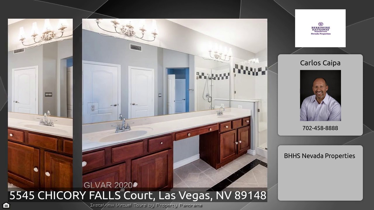 The Virtual Tour for the property at 5545 CHICORY FALLS Court, Las Vegas, NV 89148 listed for $489,999: Other homes for sale by Carlos Caipa of BHHS Nevada Properties: Great open floor plan vaulted ceilings with 4 large bedrooms and separate office/den. Formal living and dining room for entertaining. Kitchen has lots of cabinets for storage, pantry and a breakfast bar which opens up to a family room that is spacious with a fireplace. Master's suite is private with french doors. You will not be disappointed showing this beautiful home.