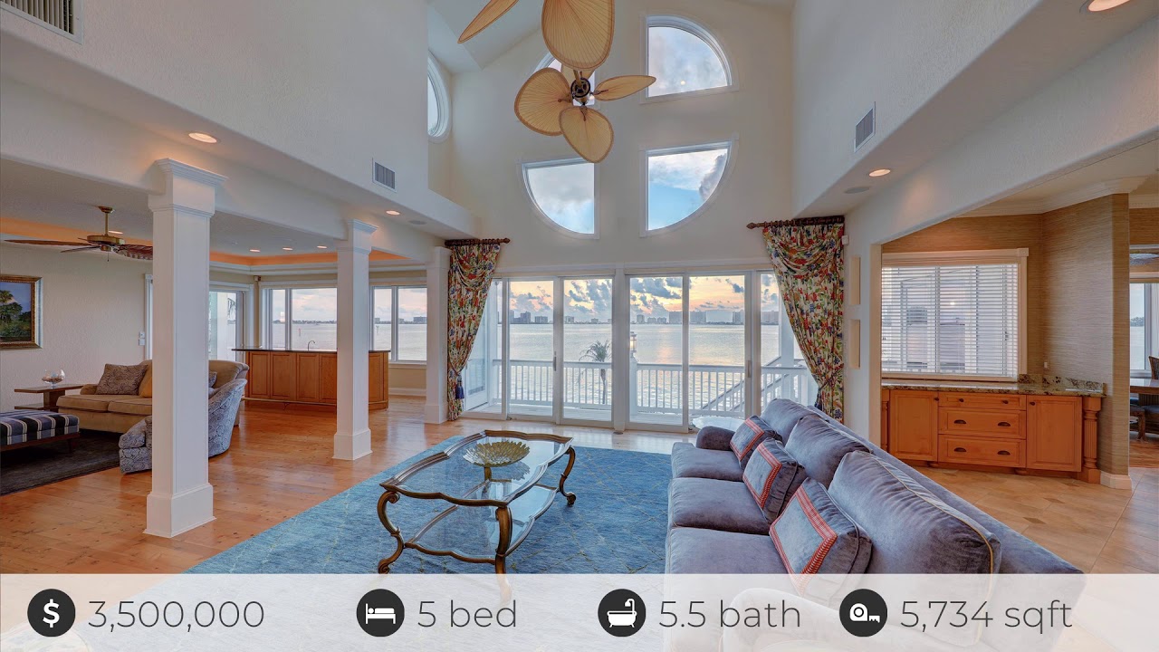 See the Property Website! :: Scott & Amy Ferguson – Coastal Properties Group International/Christie’s International – 727-744-0993 & 727-644-1254 :: Exclusive Waterfront Estate on Private Belleview Island, a stunning statement of refinement and coastal comfort. This impeccably designed, tropically landscaped estate on a double lot sits atop 2.29 acres in the highly sought after, double gated, private island community of Belleview Island with only 31 homes, with 159 of seawall. This 5,734sf, 5 bedroom, 5 bath, 3 floor elevator, custom home is the perfect setting for indulgent relaxation or lavish entertaining both inside and outside the home, with wrap around verandas and terraces that capture unobstructed views of Clearwater Harbor, Sand Key, Belleair & Memorial Causeway Bridges and the Gulf of Mexico beyond. You will immediately take note of the exceptionally fine details and incredible architectural features in this home, which are as distinctively stylish as they are tastefully comfortable. This prime waterfront location provides boaters quick access to Clearwater pass and the open waters of the Gulf of Mexico. Exemplifying understated elegance, the timeless design features clean, open spaces, and places dramatic emphasis on panoramic water views. The island welcomes you through security gates to the stunning approach to the home, with a paver motor court, and a grand stairway to the lovely front porch, with views of the St Andrews Pond & fountains. Beyond the double door entry into the grand foyer, you are immediately met with spectacular & unforgettable water views. You are drenched in brilliant natural light, with windows to the very top of soaring 21 ceilings, a barrel ceiling at the apex, with a winding marble staircase, marble flooring with a mosaic nautical medallion inlay, and a glittering Schonbek chandelier. The spectacular details in this home are endless. An exquisite chef friendly gourmet kitchen, with tiered granite island breakfast bar, and separate coffee bar, Straub & Harden House wood kitchen cabinetry with rollout drawers, 4 burner Wolf gas stove with grill and griddle, & double ovens, full sized Sub Zero Refrigerator and full sized Freezer, Bosch dishwasher with cabinet front, Fisher and Paykel 2 drawer dishwasher, a warming drawer, 2 Sub Zero cold drawers, and tile flooring with tumbled stone inlays to match the backsplash. The informal dining area flows from the kitchen, and is surrounded by huge windows with spectacular water views on 3 sides, and French doors to access the verandah. The kitchen is fully integrated and open to the living areas, blending seamlessly with the western horizon and yearlong sunsets. Inclusive of the informal dining room, all the main living areas and bedrooms of the home feature gorgeous Australian Cypress flooring throughout, ceiling fans, crown molding, beautiful custom built in millwork, and custom shaped windows. In the elegant formal dining room with adjacent dessert room, each room features a unique and sparkling chandelier. The dessert room is accented with built in curio niches. Adorning the dining room, a wood burning fireplace with coral stone face and mantle, doors to the front terrace, and beautiful shaped windows up to the 21 ceiling, including a barrel ceiling with trompe l oeil painting at the apex and a Schonbek chandelier. The formal living room is open and spacious, surrounded with an abundance of natural light, with beautifully appointed, shaped windows up to the very top of the 21 ceilings, and French doors to the verandah overlooking the pool, and west facing water views. The great room impresses with tray ceilings and under lighting, a gas fireplace, built in entertainment center and cabinetry, wet bar, with inset refrigerator, tiered granite, and wood cabinetry. This room is yet another space with spectacular water views, large windows, and sliding glass doors to the welcoming wraparound verandah. The library impresses with a handsome built in desk area and bookcases, wet bar with granite countertop and wood cabinetry, coffered ceilings, coved ceiling with under-lighting, gas fireplace, faux paint, French Doors to the front terrace, and large windows inviting an abundance of natural light. A spacious and lovely main level master suite, with spacious his and her custom walk in closets is a luxurious and relaxing haven, surrounded by windows on 3 sides to enjoy the incredible views in every direction, with French doors on all 3 sides leading to a wrap around verandah. Sit out on the verandah and relax, take in the sound of the ocean, and listen to the coconut palm trees swaying in the Gulf breezes, while enjoying the incredible view. The accompanying master en suite offers a spa-like atmosphere, ensconced in honeysuckle onyx, inclusive of the dual sinks, vanity, countertops. Lovely limestone flooring, a jetted tub, a private water closet with pocket door, and high ceilings with beautiful windows accompany a s