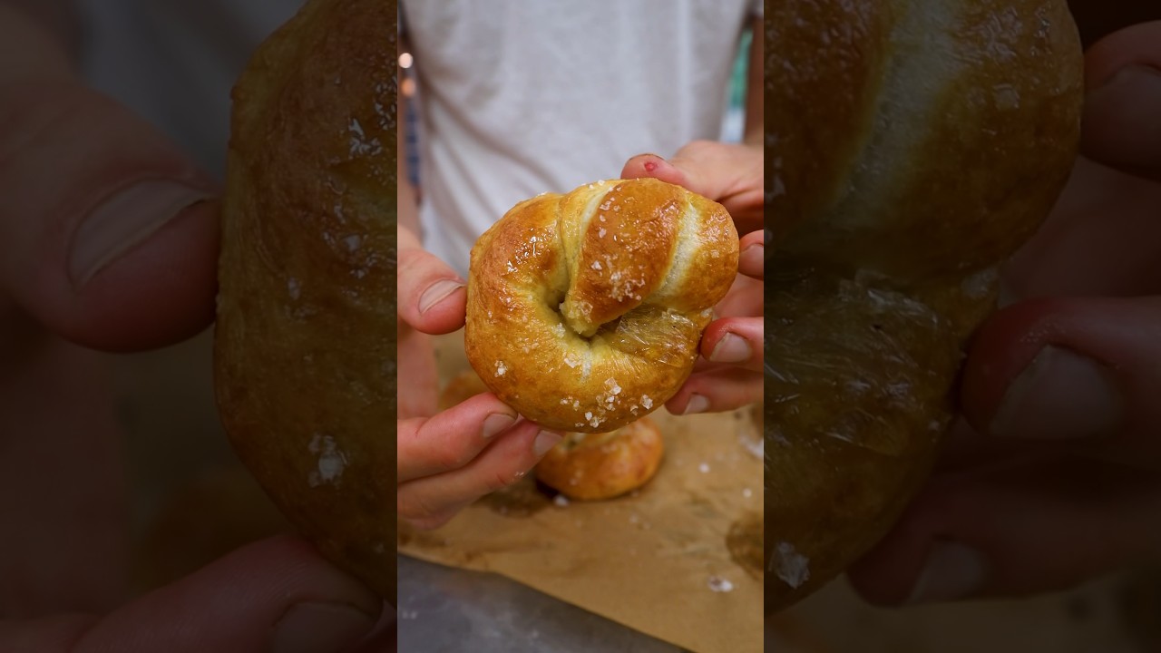 Instructions: 1. Cut the dough into small round, weight about 50-55 grams. Roll them out into a long string. 2. Twist the string into a knot and set aside. 3. Bring about 4 – 5 cups of water to a boil in large pot or wok and add in baking soda. 4. Drop in the pretzels into the water and cook for 1 minute. 5. Drain them and place them onto a silicone lined baking sheet. 6. Sprinkle on some flakey salt and bake at 400F for 15 – 20 minutes or until lightly golden brown. 7. Once they come out, brush them with some garlic oil