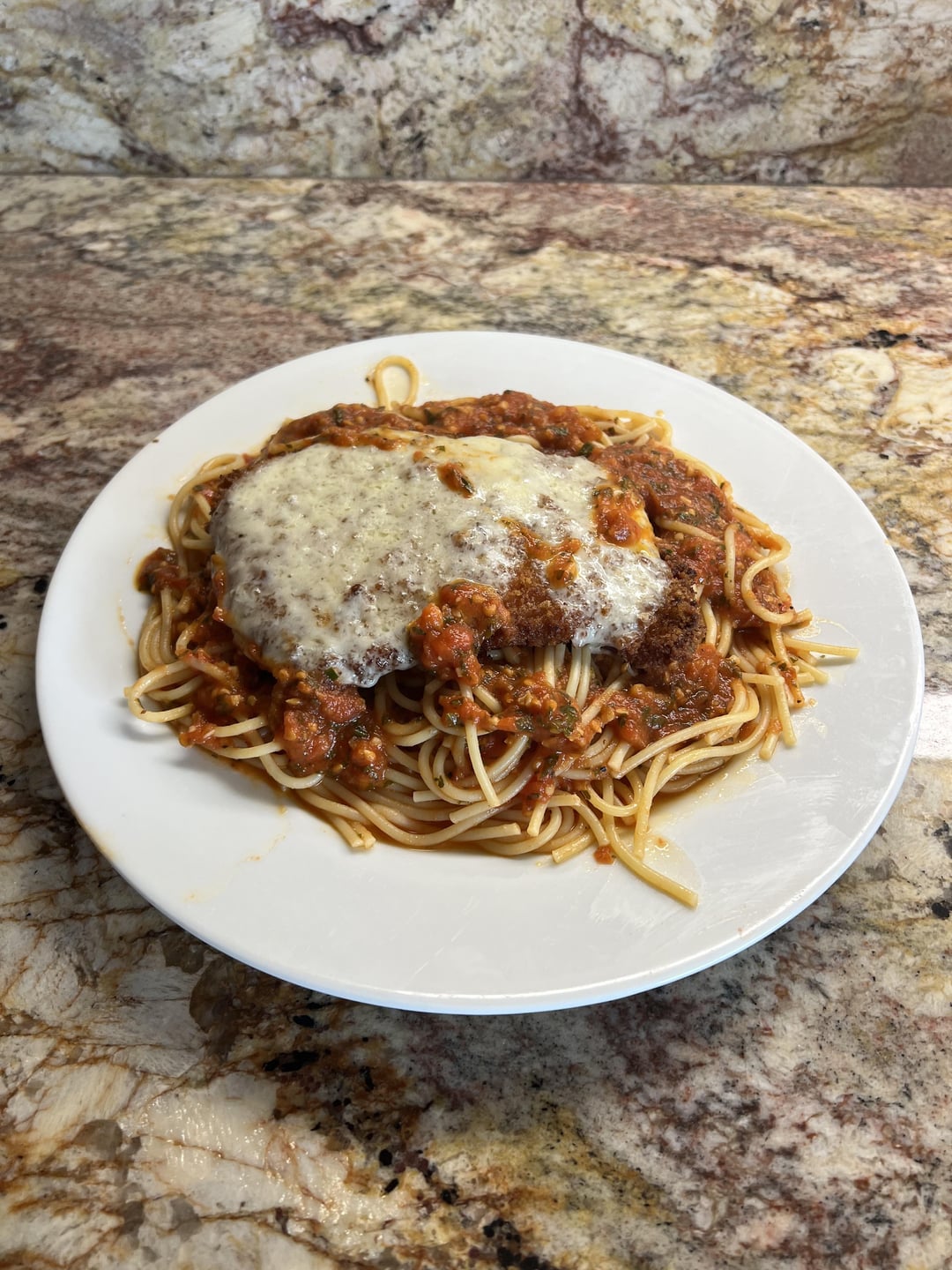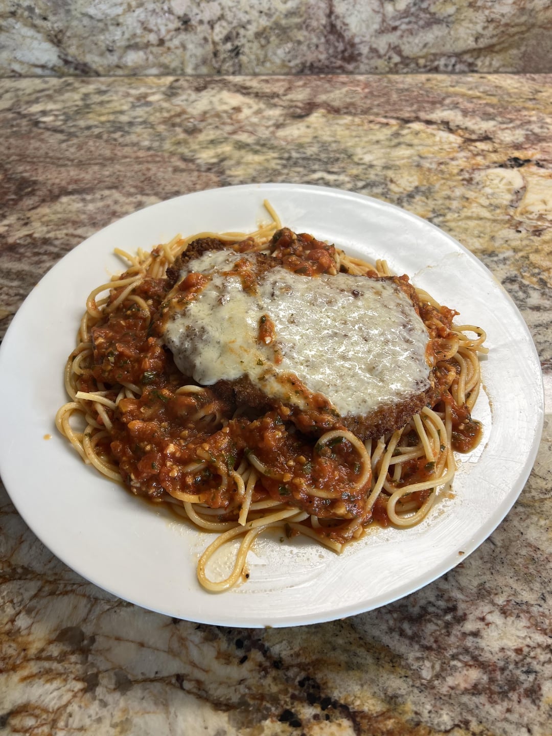 Do you have only one plate at home? Why that chickensomething is on the pasta?