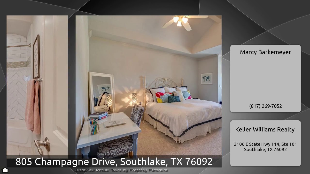 The Virtual Tour for the property at 805 Champagne Drive, Southlake, TX 76092 listed for $1,430,000: Other homes for sale by Marcy Barkemeyer of Keller Williams Realty: Gorgeous Carillon custom home. Spacious French inspired open plan is adorned with upgrades from groin vault & coffered ceilings to moldings & marble. The kitchen hosts Thermador appliances, wine refrigerator, over-sized island & breakfast bar, perfect for entertaining. Master suite features see through fireplace to bathroom featuring air tub, separate shower & large walk-in closet with steel tornado shelter. Second Master …