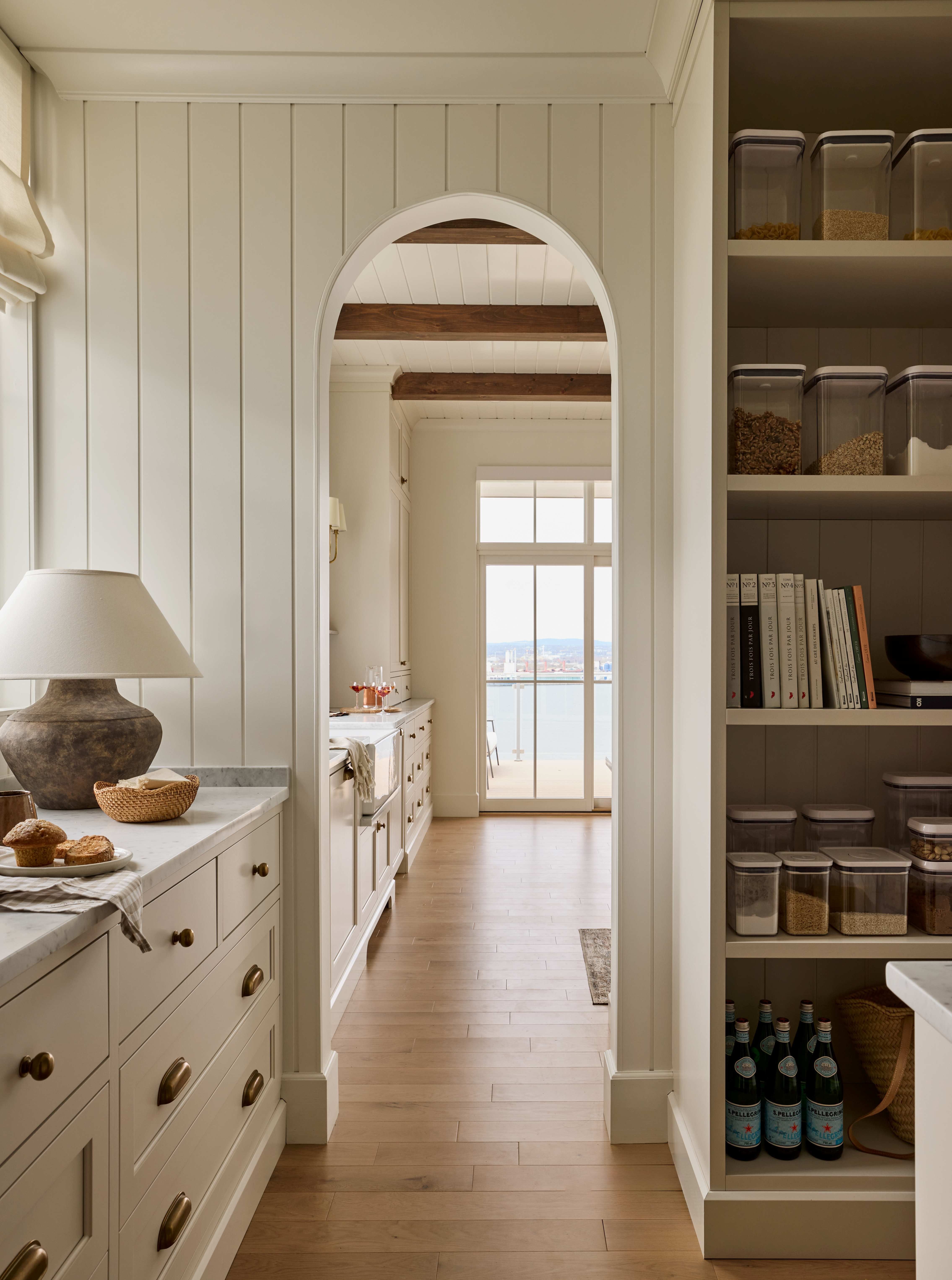 Kitchen and dining space with views of Quebec City across the St. Lawrence River seen through the arched pantry entrance, Lévis, eastern Quebec, Canada [4541×6103]