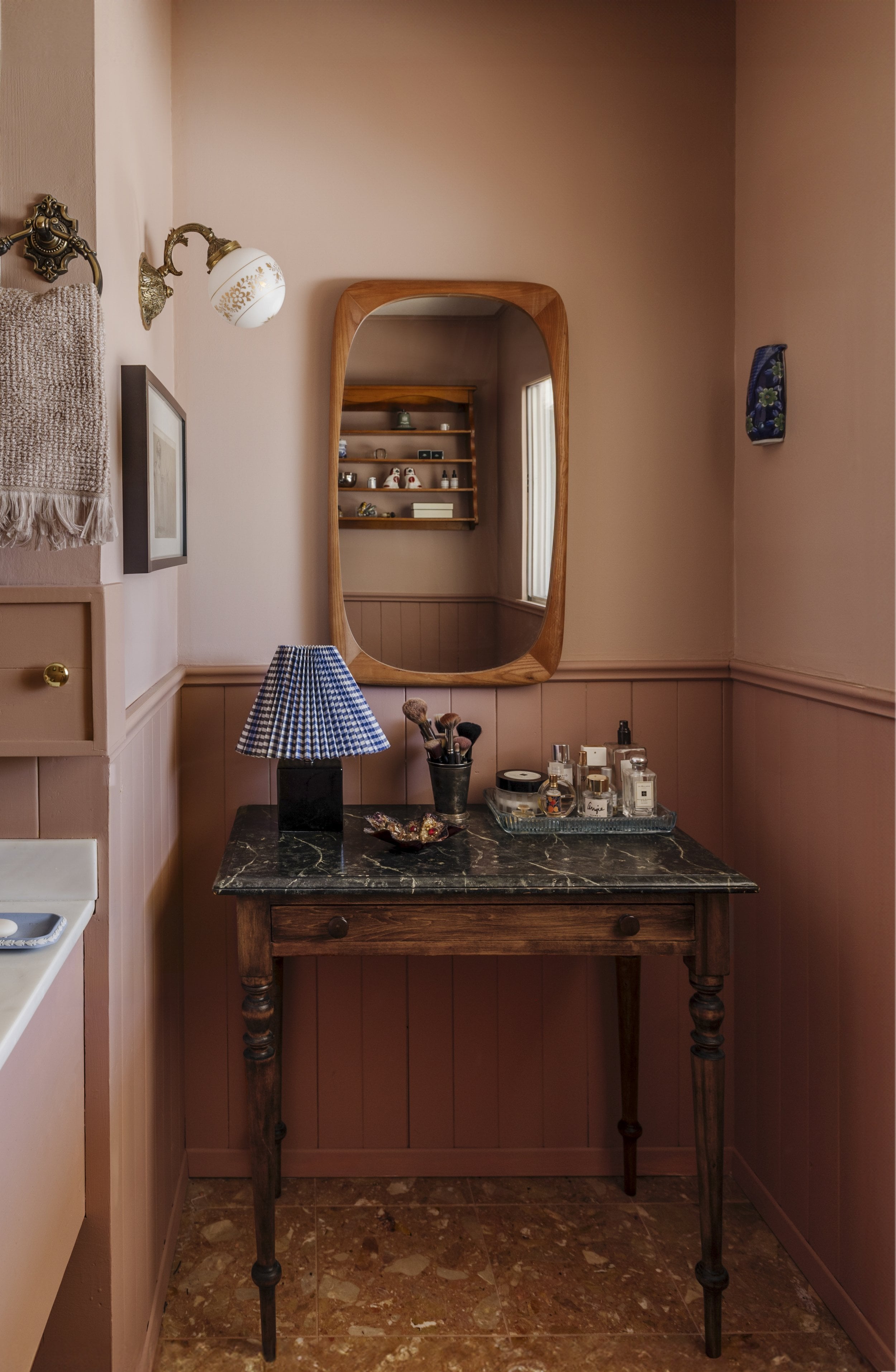Bathroom with pink terrazzo floors in a renovated 1958 bungalow, Calgary, Alberta, Canada [2500×3828]