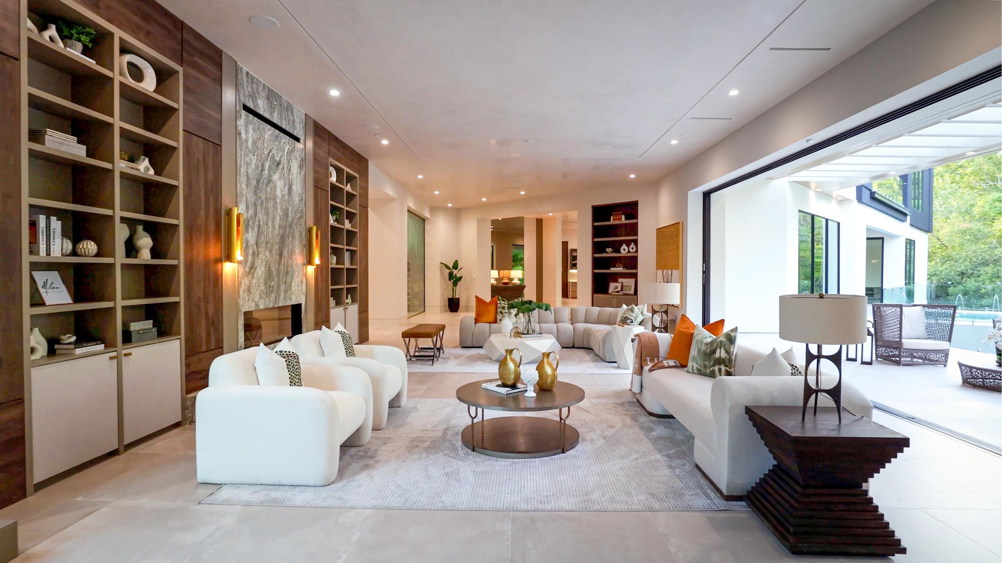 Massive Living Room With Built-Ins, Marble Fireplace, and Huge Floor to Ceiling Sliding Door Leading To Gorgeous Pool and Outdoor Space Located in Houston, Texas [3456×1944]