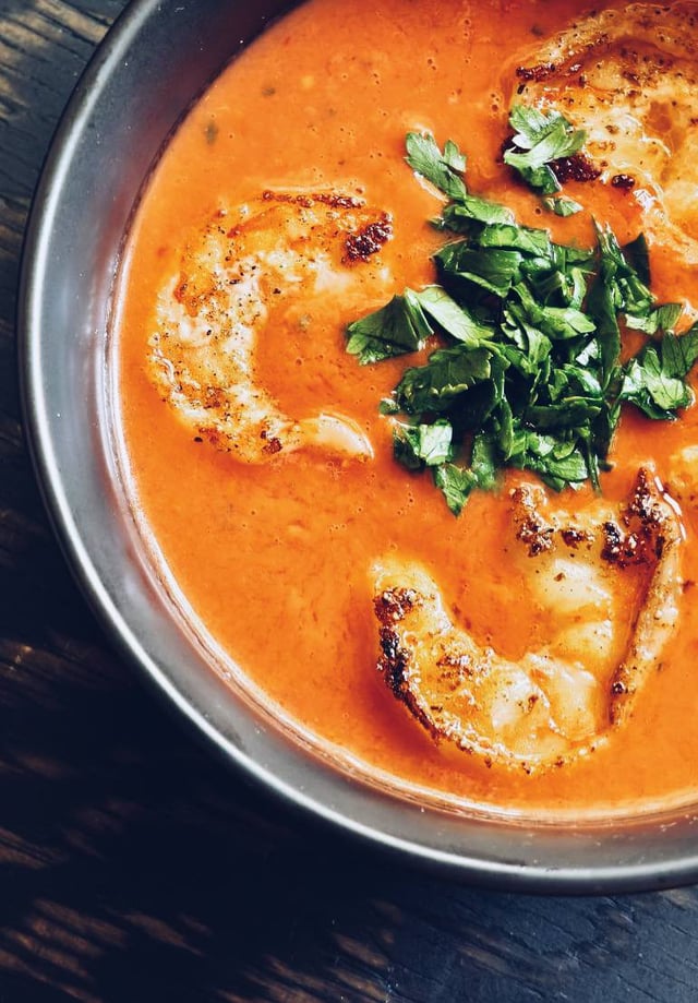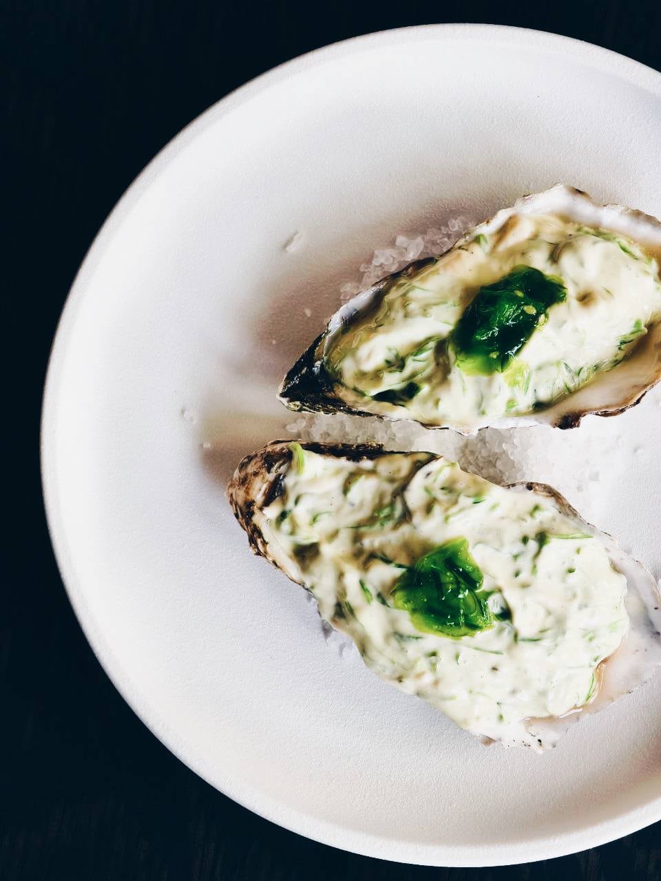 Mes nouveaux plats au menu : Gaspacho aux crevettes ; huîtres pochées au court bouillon à base de sauce soja et mayonnaise maison aux algues marinées.