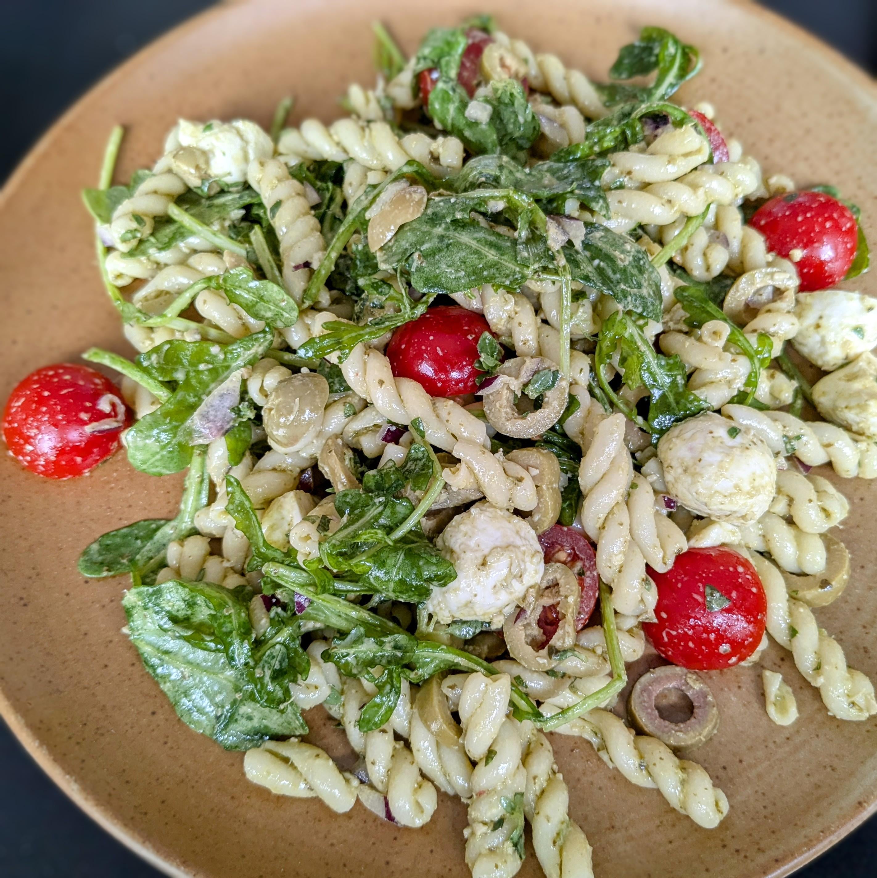 Un grand classique incontournable de l'été : la salade de pâtes au pesto avec roquette, olives vertes, mozzarella, tomates. (Avant je mettais aussi des pignons de pin mais vu le prix… j'ai arrêté. Parfois je les remplace par des graines de tournesol.) Pro tip : cuire les pâtes et les mélanger à la sauce (pesto + un peu d'eau de cuisson) la veille et bien laisser refroidir au frigo.