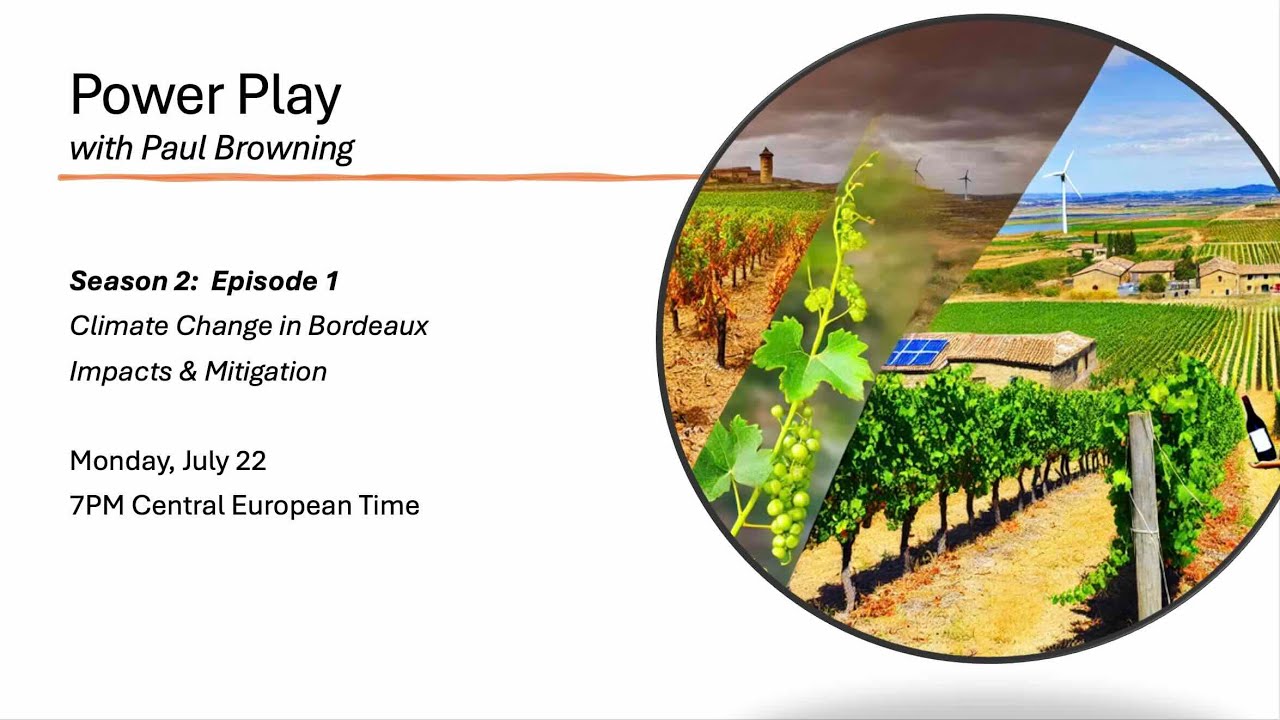Power Play is a video podcast that travels the world to explore the hard truths of the energy transition. In this first episode of Season 2, we travel to Bordeaux, France to explore the impacts and mitigations of climate change for winemakers in Bordeaux. Surprisingly, climate change has actually improved the chances of Bordeaux producing a great vintage, but further warming could reverse that trend. Winemakers are responding with new grape varietals and more aggressive vineyard management.