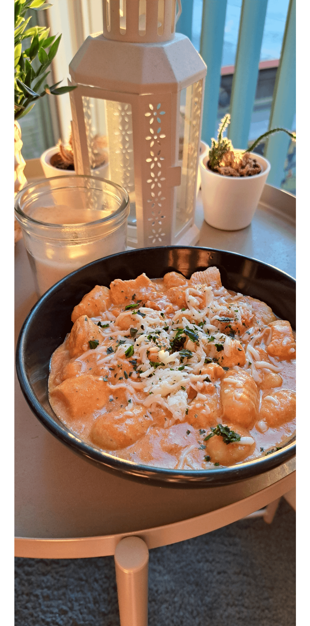 Gnocchis au poulet, crème, tomates, pesto rosso