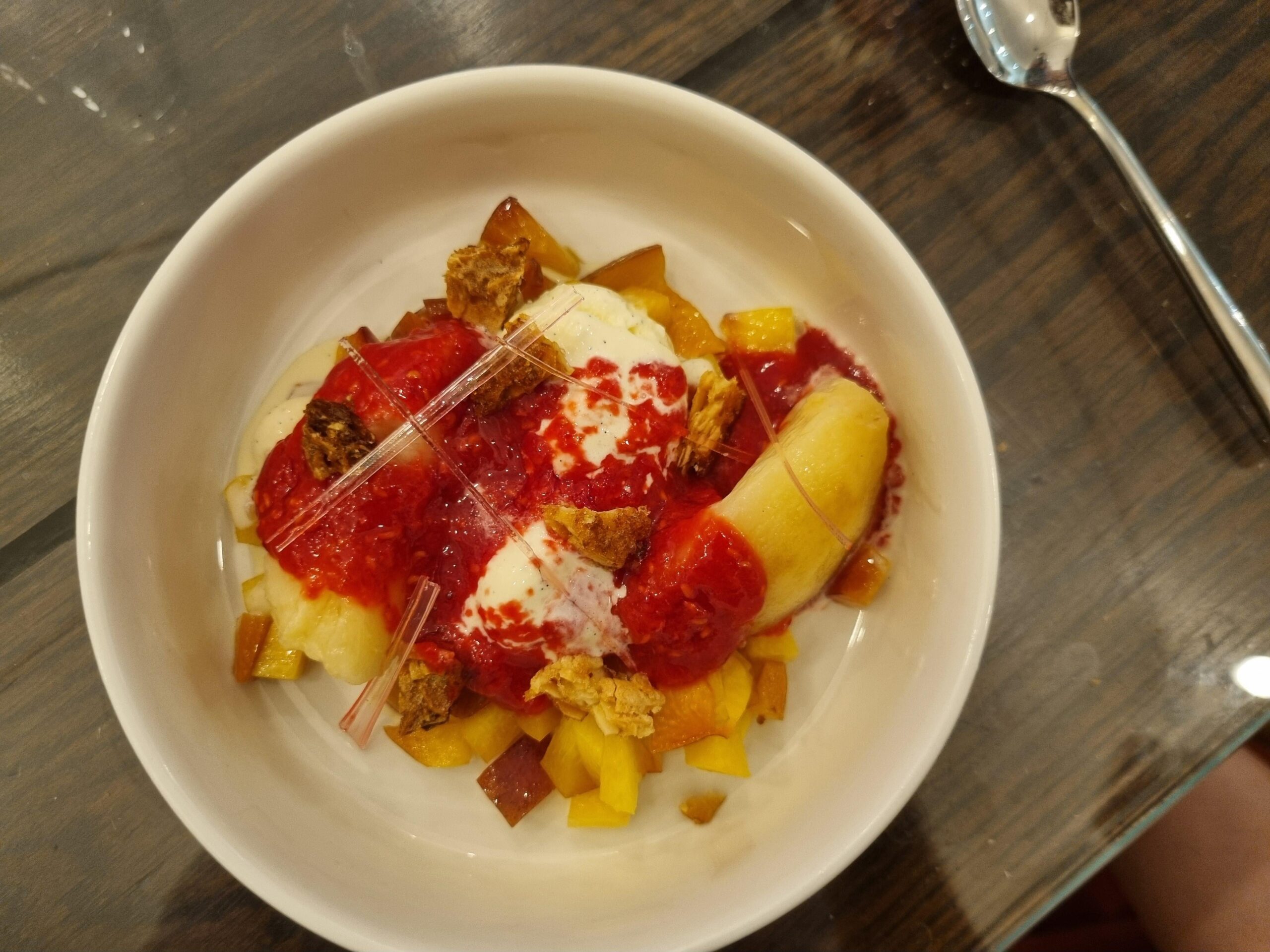 4 – Dressage : brunoise de pêches pour faire un nid, 2 boulles de glace à la vanille, les pêches pochées par dessus, purée de framboise sur le tout, et j'ai ajouté les éclats de tuile.