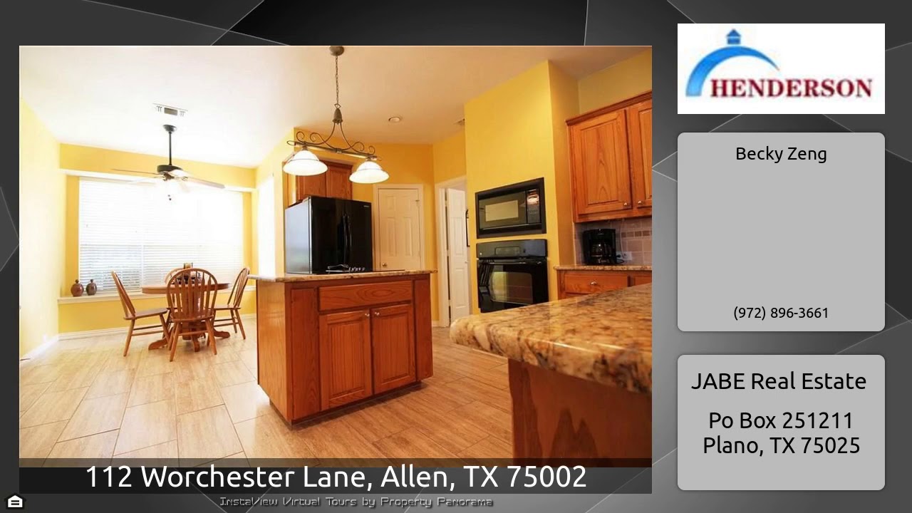 The Virtual Tour for the property at 112 Worchester Lane, Allen, TX 75002 listed for $2,750: Other homes for sale by Becky Zeng of JABE Real Estate: Fabulous 5 bedroom home with pool, spa, large fenced yard and outdoor living space! Relax and enjoy enclosed air-conditioned sunroom with gorgeous french doors from master. Open kitchen & family room. Hardwood floor in family room, dining room and master bedroom. Spacious kitchen with granite counter and island. Wonderful master suite down; 4 bedrooms, 2 bathrooms & large game room up. Neutral decor. Nice and large backyard with pool, spa and …
