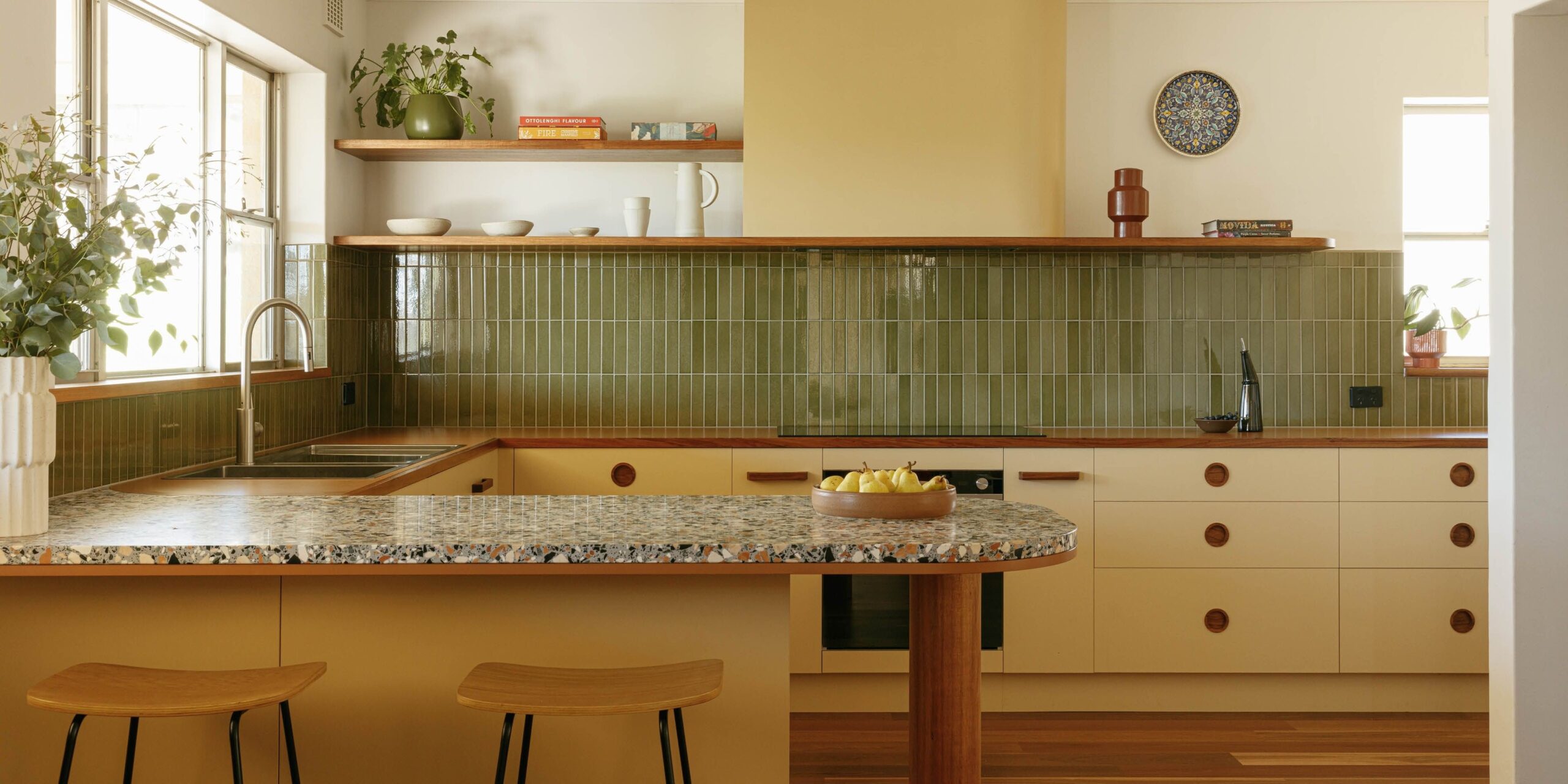 Kitchen renovation with mustard yellow cabinetry and green tiles in a Mid-century house, Angaston, Barossa Valley, South Australia [4000×2000]