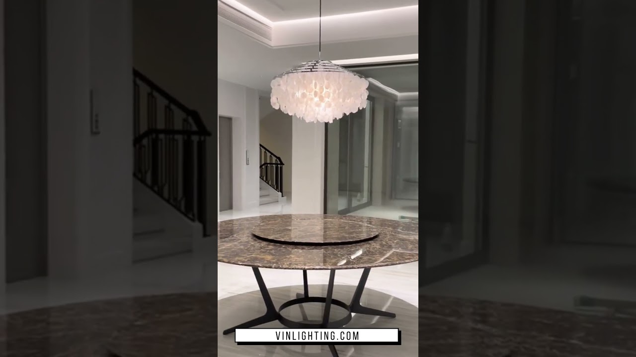 Discover elegance with the Sea-shell FUN DM Suspension Lamp. Featuring a sleek chrome-plated frame, this contemporary fixture boasts tiered metal rings cascading with shell disc chains. Its varying lengths create captivating light effects, transforming any 2-story foyer or dining room into a luminous haven. Ideal for modern interiors, this round hanging lamp combines French chic with innovative design, using translucent shells to scatter light beautifully. @vinlighting