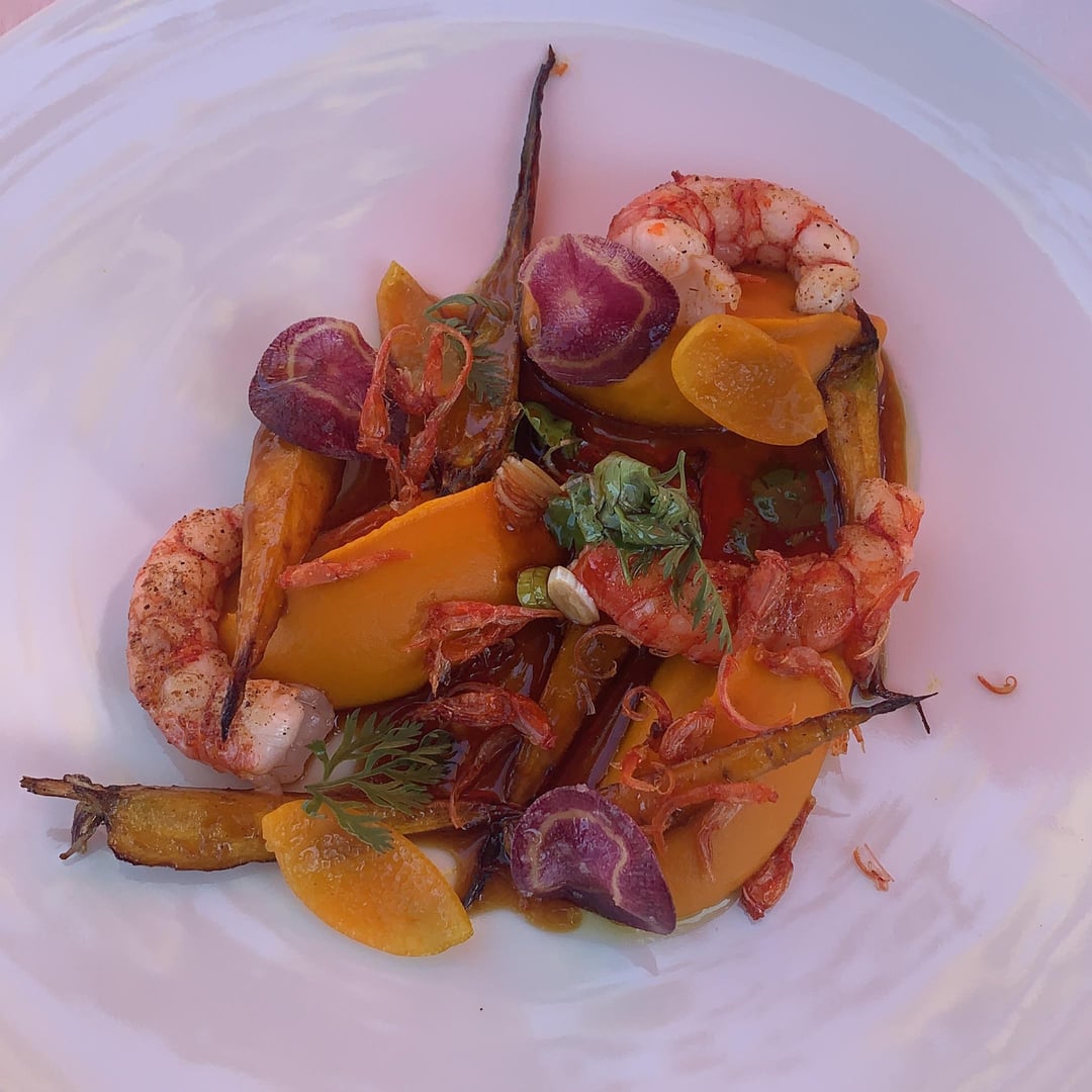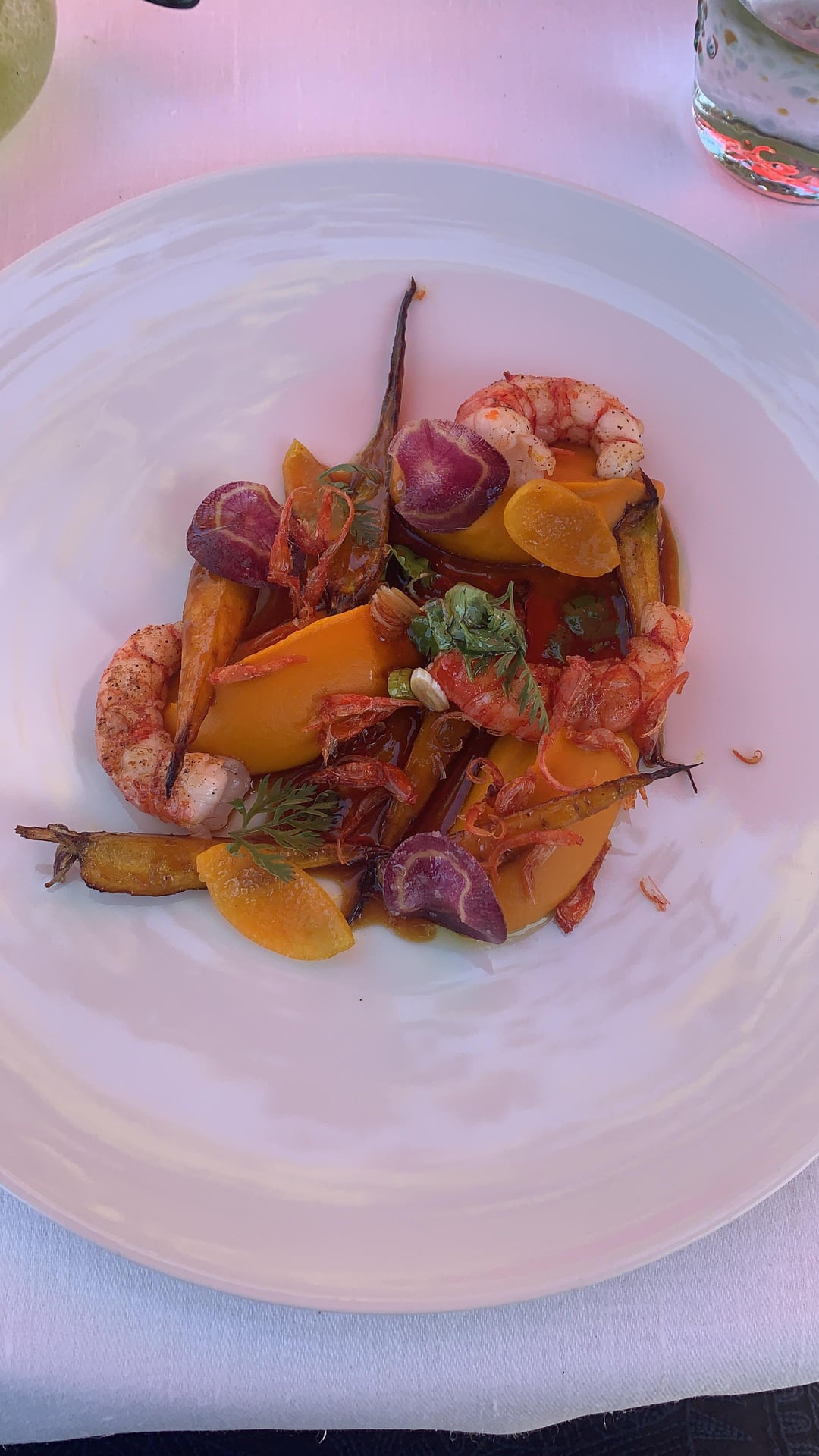Les entrées, l’une Carotte-Gambero rosso, l’autre Pêche-Hareng-Fenouil. Tous les légumes viennent de producteurs du coin. Les goûts des produits sont connus mais hors de l’ordinaire.