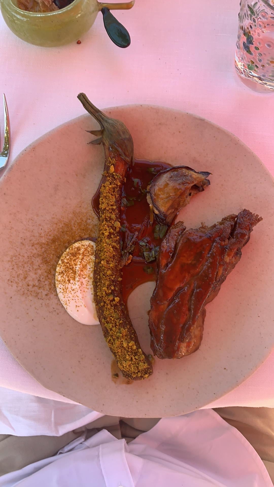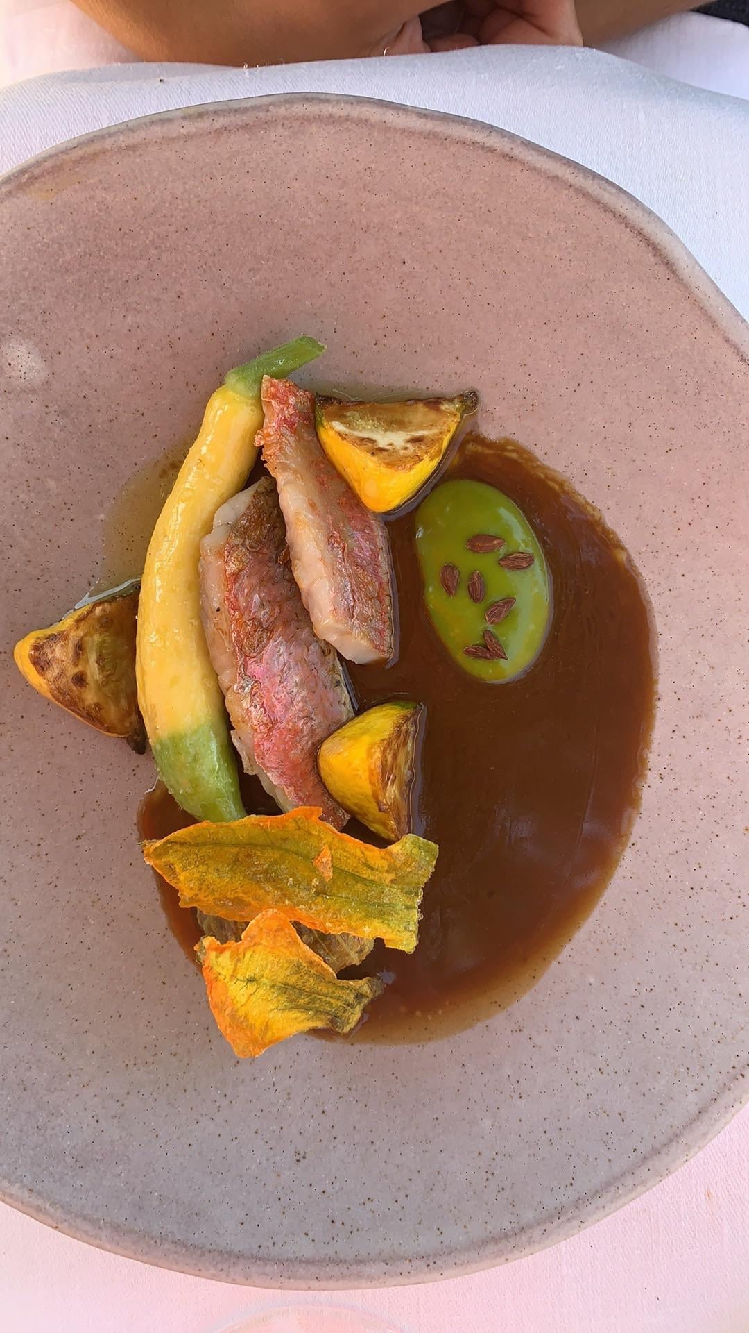 Les plats, l’un Aubergine-Veau-Dukkah, l’autre Courgette-Rouget. Les sauces bien réduites sont délicieuses.