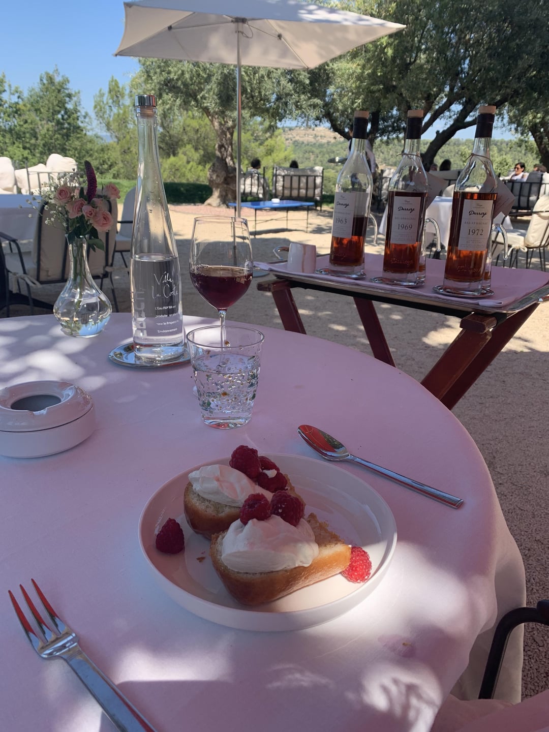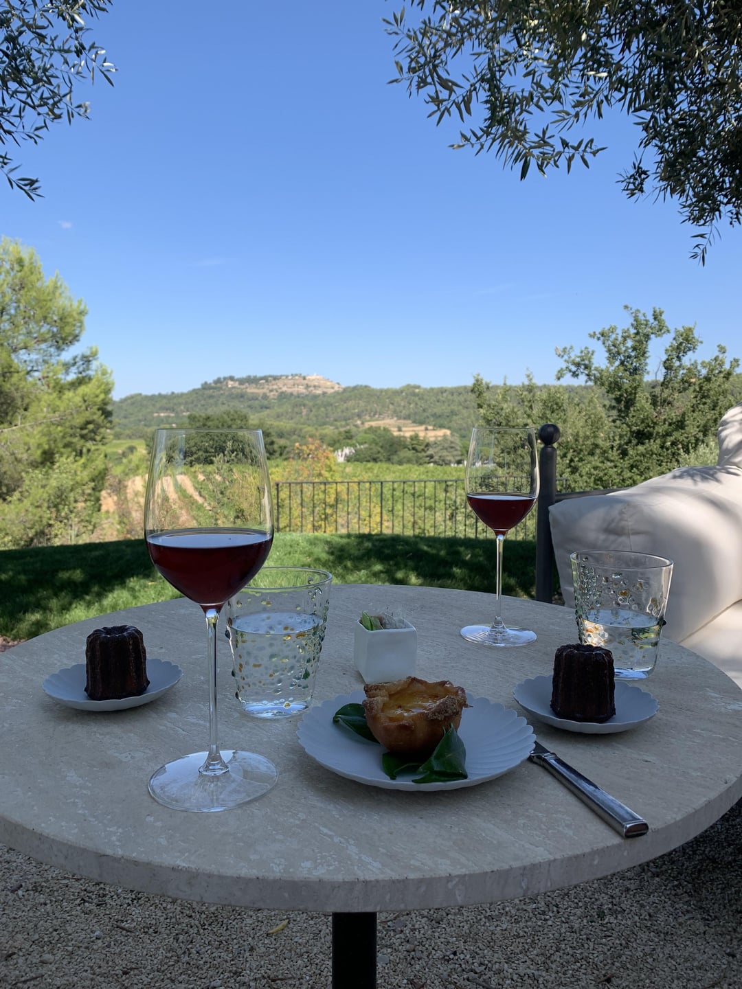 Nous finissons le repas en contemplant les vignes sous le doux soleil de Provence, avec un vin moelleux, un cannelé et une pêche en pâte brisée.