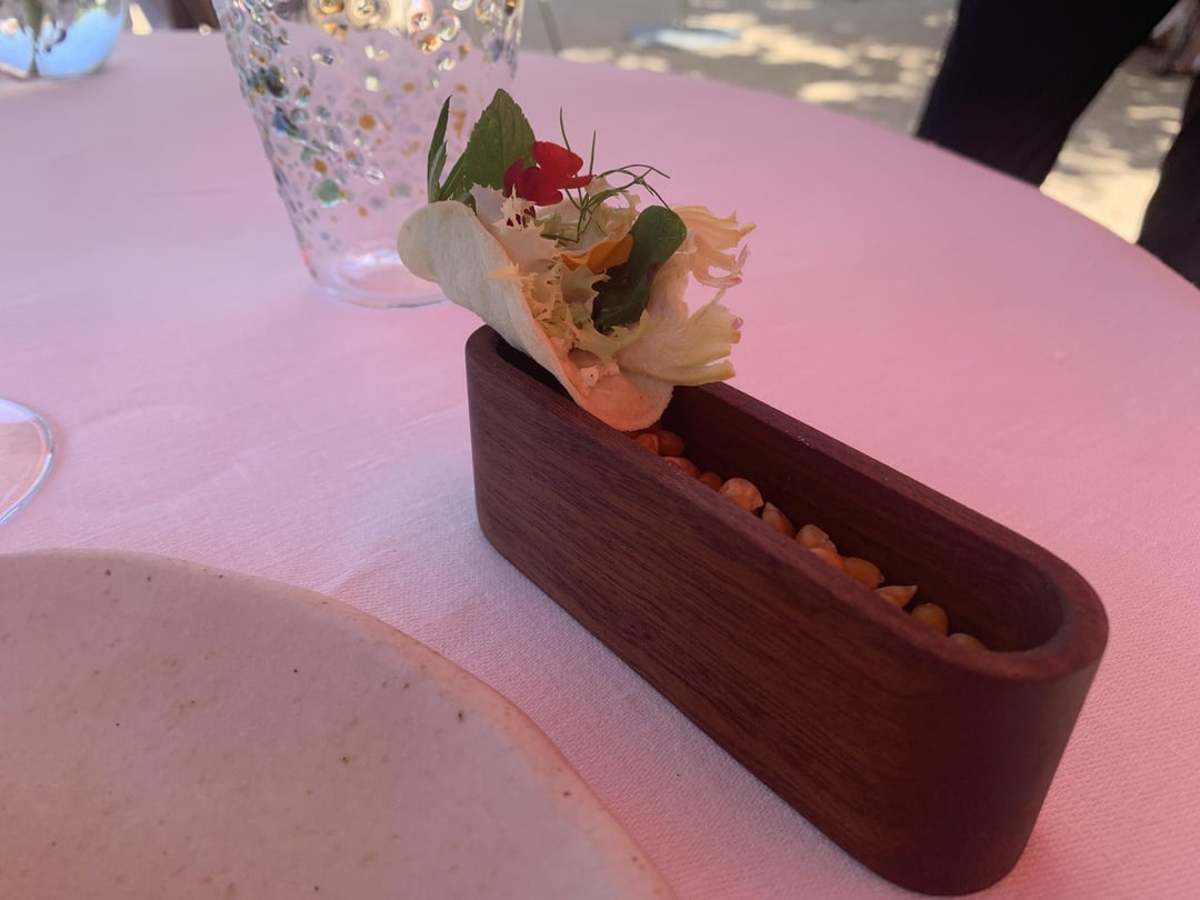Pour commencer ce déjeuner, un mini tacos de maïs, fromage de chèvre, herbes & fleur du jardin… Craquant et frais.