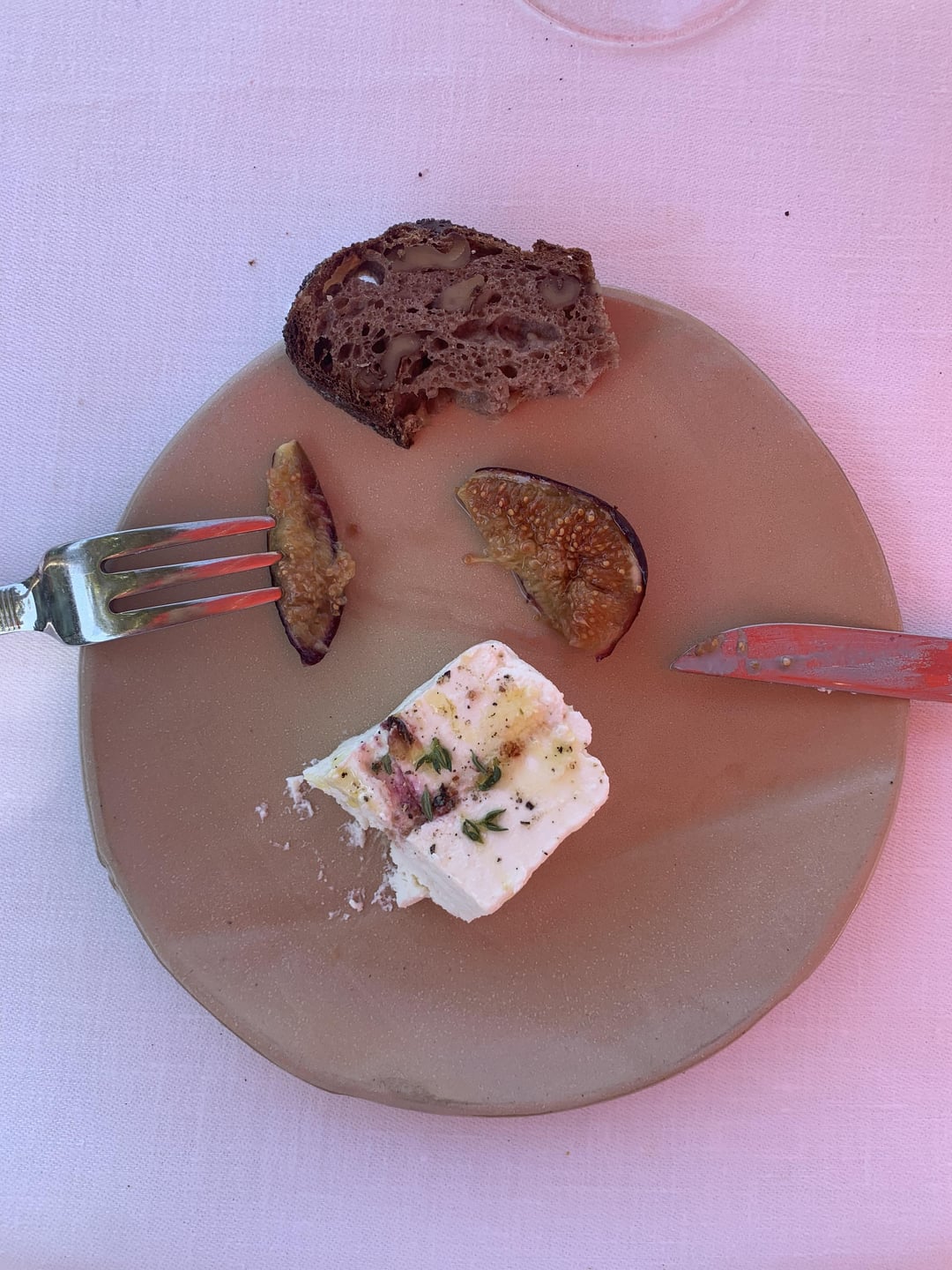 Le fromage, un fromage de chèvre frais d’un producteur du coin, figue, huile d’olive, fleur de sel. Rien à dire.