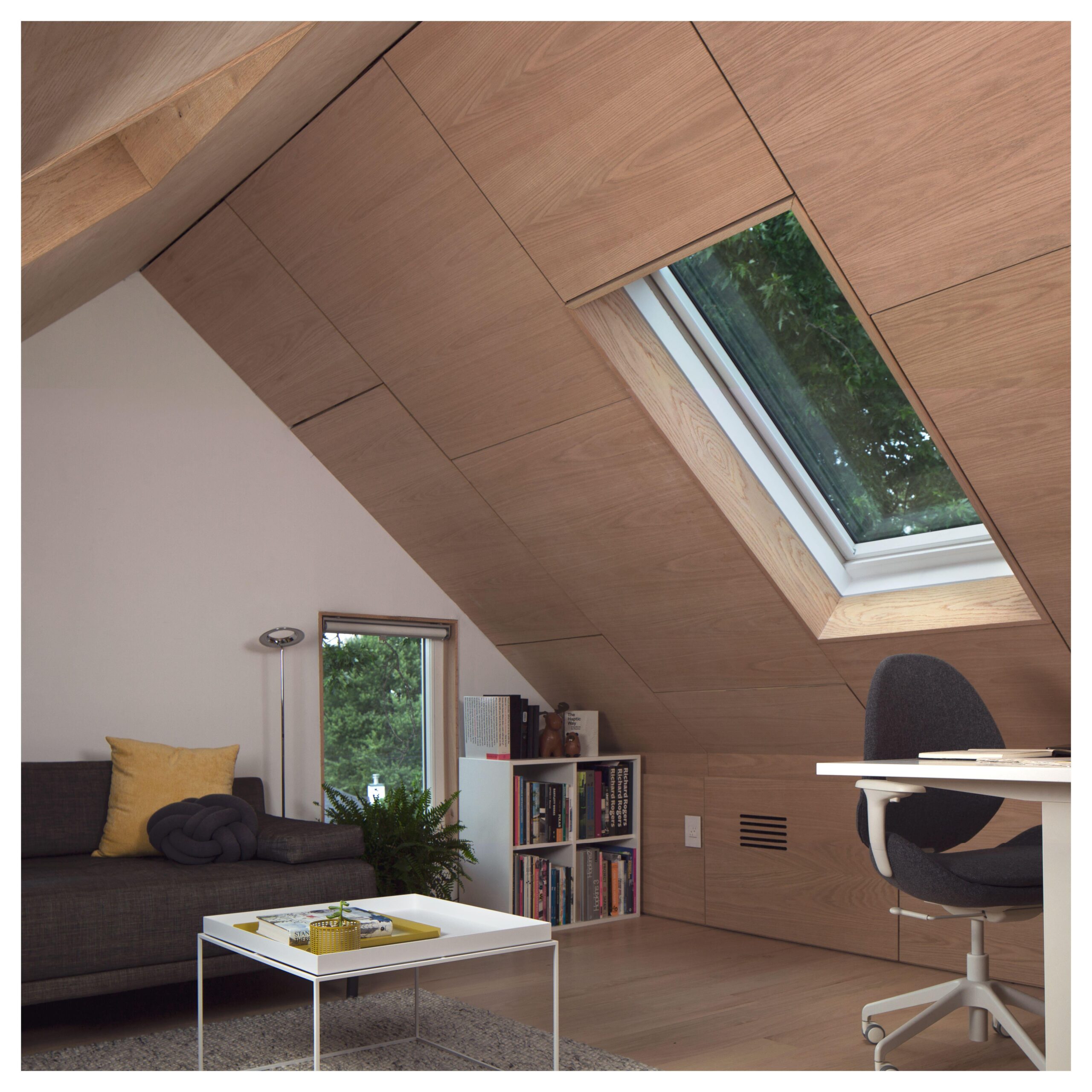 Designed and executed by me, this previously unused and inaccessible attic space has been integrated into the existing home with a new custom timber staircase and features locally sourced red oak panels, evoking the mountain cabins of Norway in which I spent many a cozy winter evening