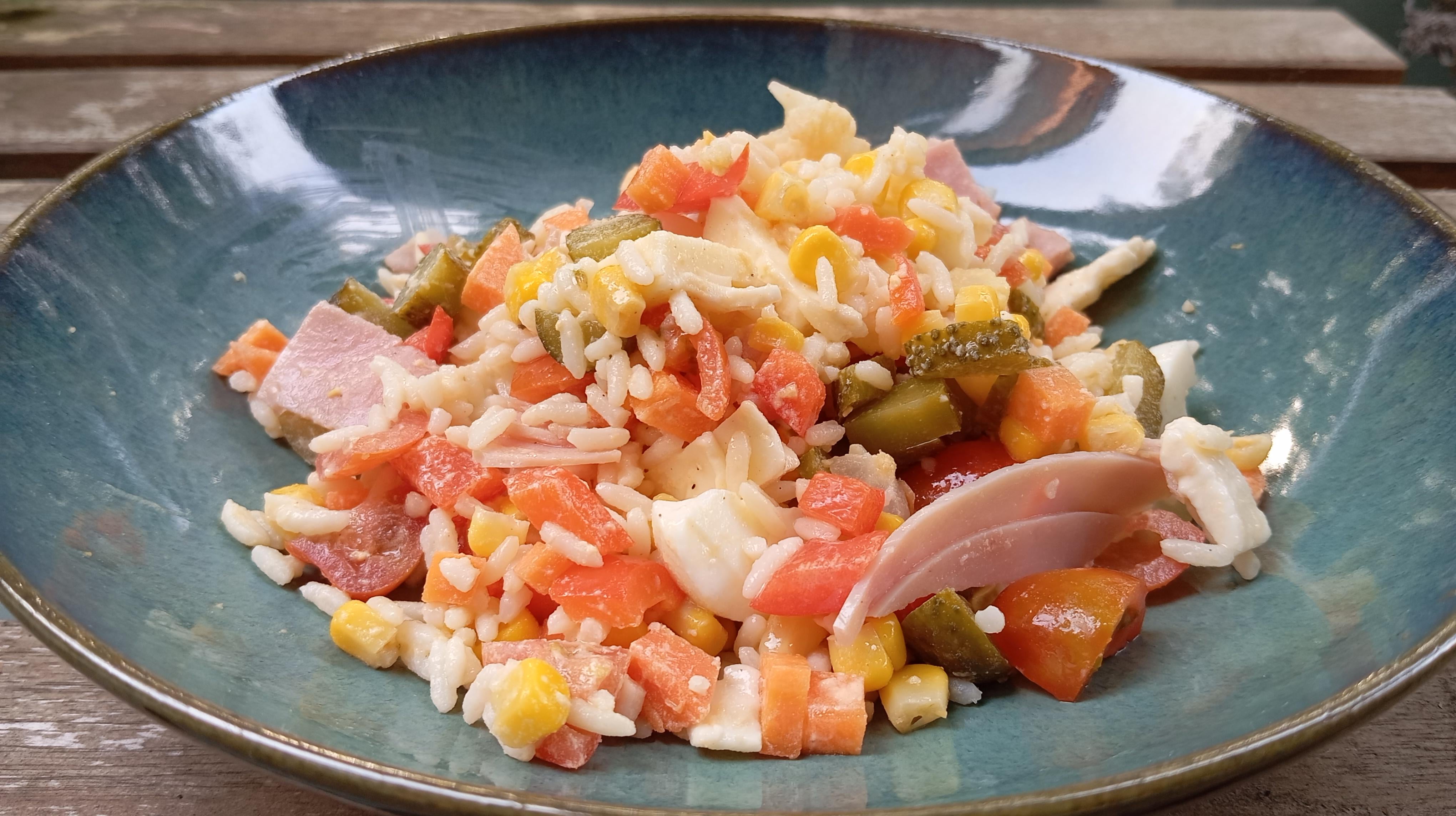 Rice, mixed pickles, tomato, bell peppers, carrots, corn, eggs, ham, cheese.