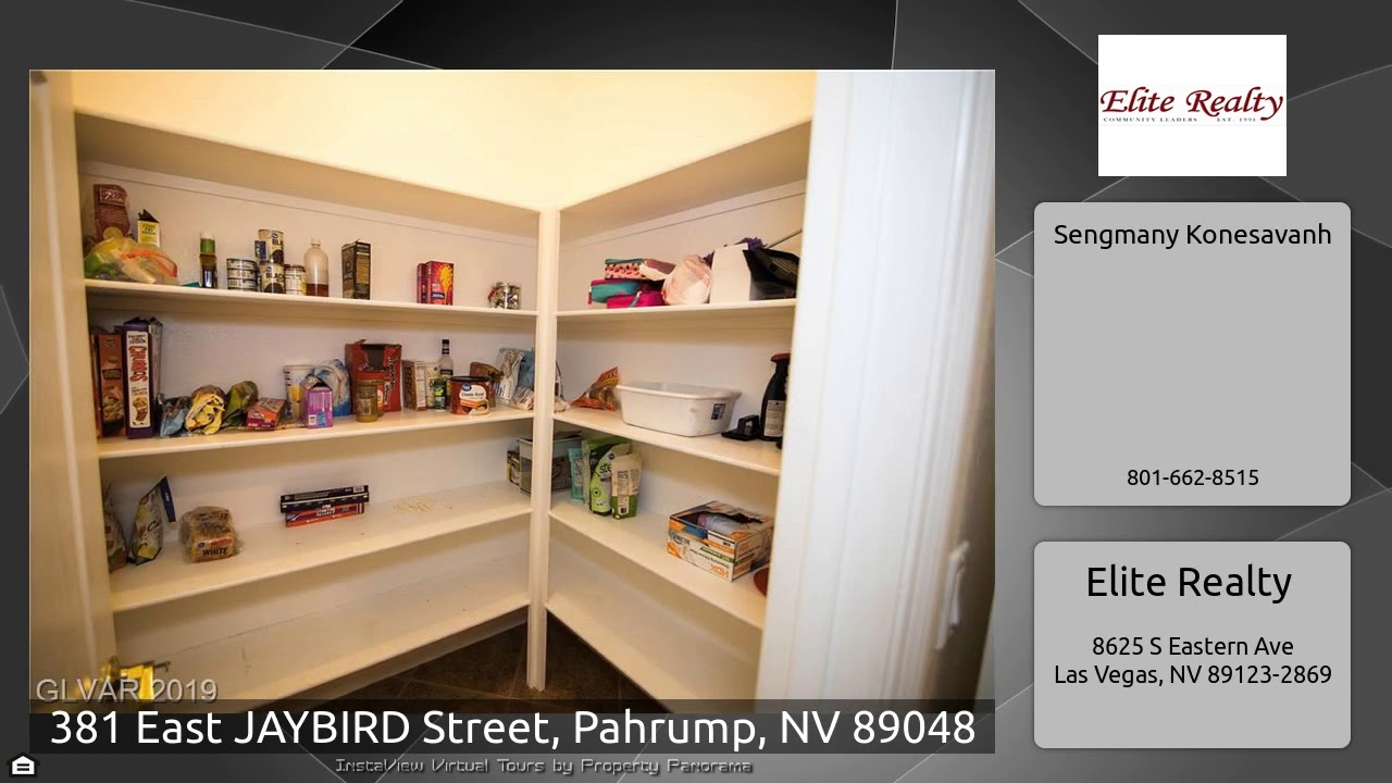 The Virtual Tour for the property at 381 East JAYBIRD Street, Pahrump, NV 89048 listed for $329,900: Other homes for sale by Sengmany Konesavanh of Elite Realty: Spacious single story with 3 car fully fenced w/2 detached garage & RV gate. Bright & airy family room wood-burning fireplace connected to open kitchen w/granite breakfast bar & stainless steel appliances features upgraded cabinets which leads into formal dining room. Master suite offers French doors w/build-in blinds access to backyard covered patio. Features walk-in closet, double sinks, separated oversized walk-in shower & jetted …