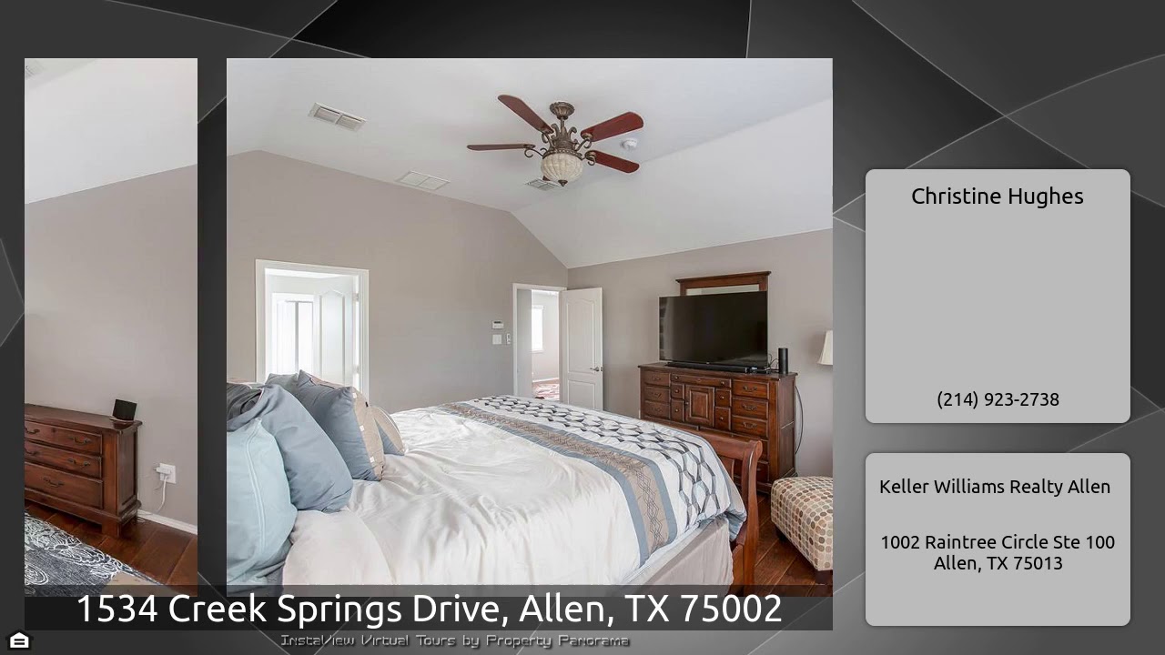 The Virtual Tour for the property at 1534 Creek Springs Drive, Allen, TX 75002 listed for $335,000: Other homes for sale by Christine Hughes of Keller Williams Realty Allen: Meticulously maintained home on corner lot in desirable Lost Creek Ranch! New roof, fence & interior paint 2019. Tile & manufactured hardwood floors throughout. No carpet! This inviting floorplan features a spacious living rm that has a corner gas fireplace and is open to brkfst area and kitchen with custom thick crown. Study with French doors can be used as formal dining. Guest room & full bath dwn. Master with en …