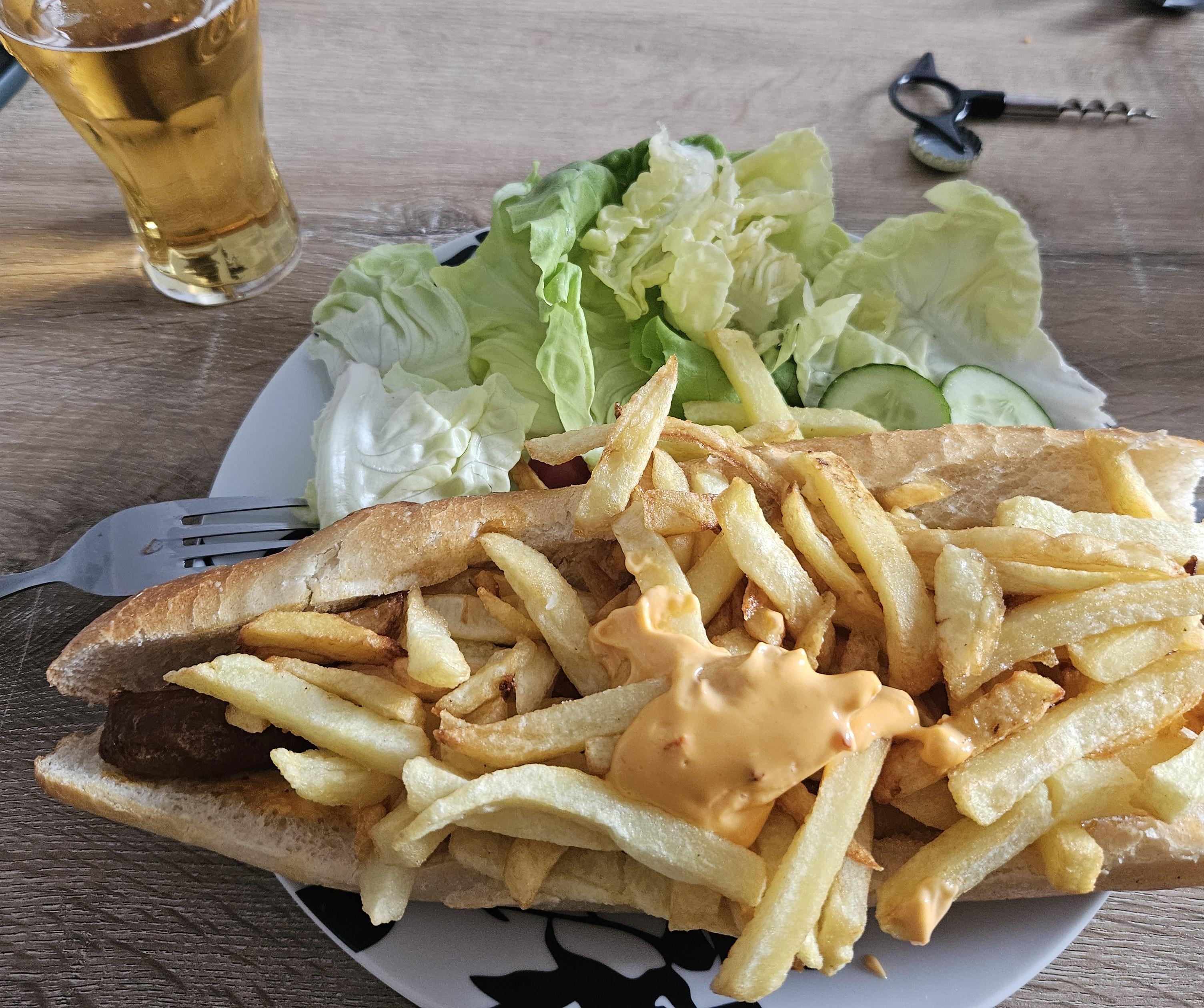 Essentially a merguez hotdog stuffed with literally the best chips in the world with samurai sauce on top. 9 euros from Chez Irene. Washed down with some Goudale Ambrée….heaven