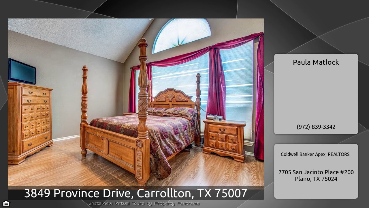The Virtual Tour for the property at 3849 Province Drive, Carrollton, TX 75007 listed for $267,500: Other homes for sale by Paula Matlock of Coldwell Banker Apex, REALTORS: Beautiful home features large, open & bright floorplan. Soaring ceilings, laminate floors, french doors. Kitchen with abundant cabinets, double oven and breakfast nook. Nook overlooks patio and yard. Formal dining overlooks covered deck. Spacious master suite with double vanity and large closet down stairs.