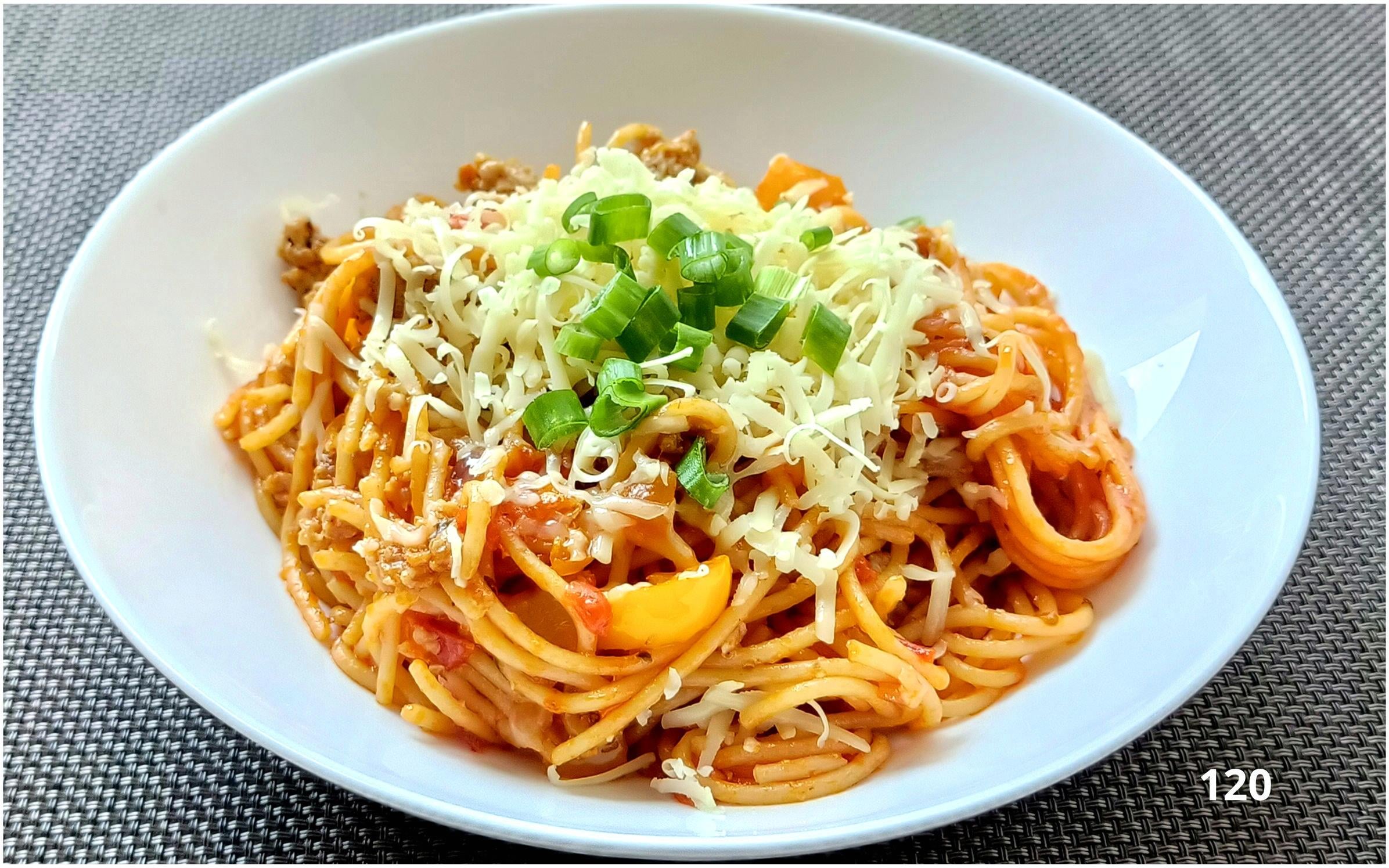 Spaghetti from one pan with minced meat on onions and spaghetti seasoning. Sprinkled with real parmesan.
