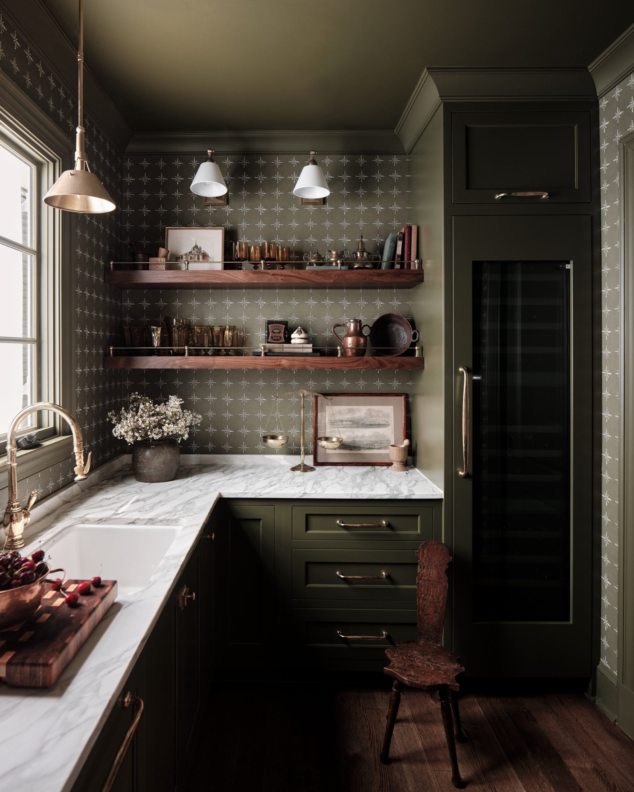 This is gorgeous. I’m not a big fan of cabinets myself so I really like the shelving with the brass. That small chair is very similar to a “birthing chair” for women to sit on while in labor. somebody had posted one a few weeks back.