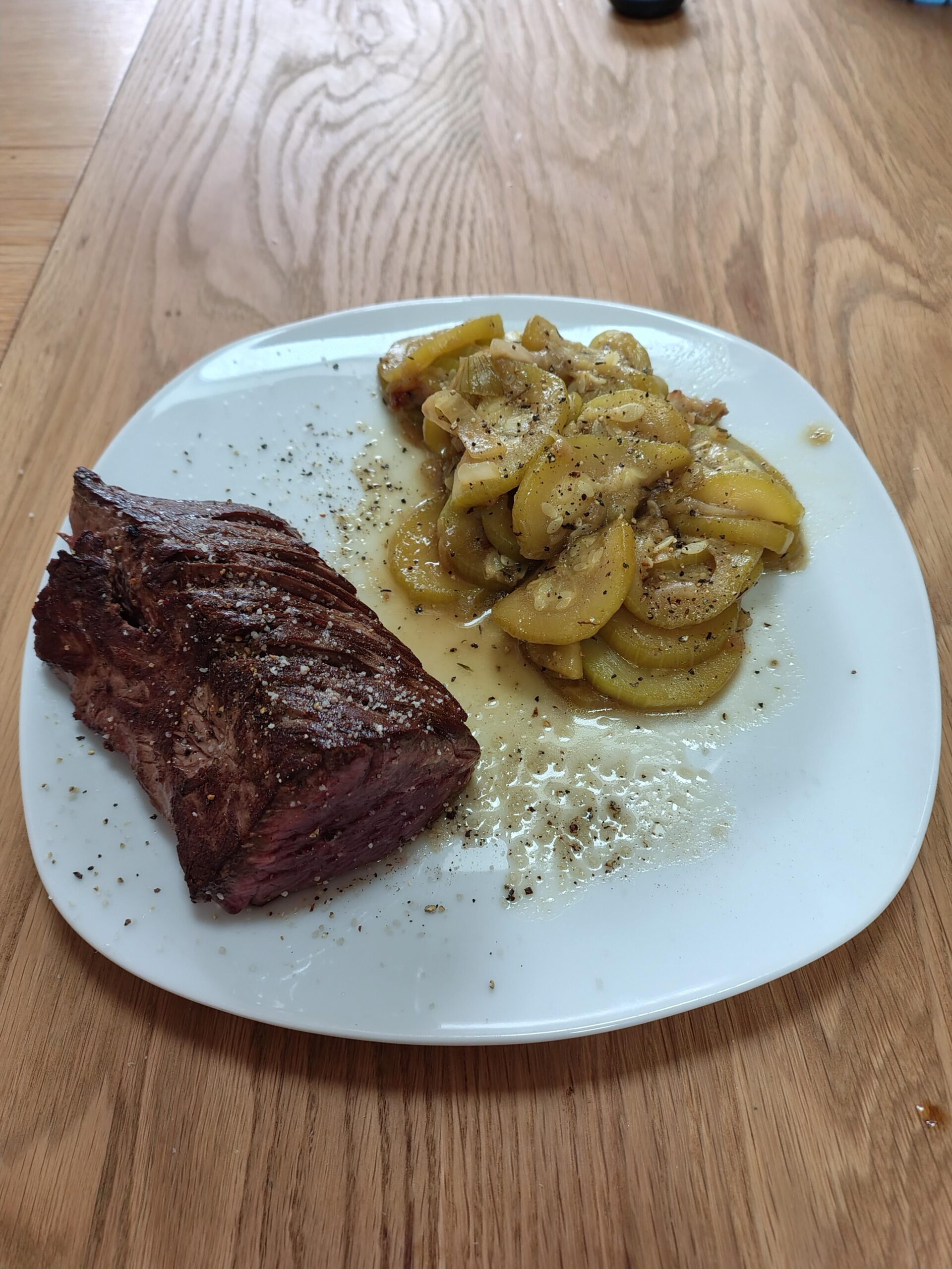 Pour le sauté de courgettes : faire revenir 1 oignons pour 2 courgettes dans de l'huile d'olive + herbes de Provence. Une fois légèrement caramélisés, ajouter les courgettes tranchées puis à feu moyen vif, faire revenir le tout