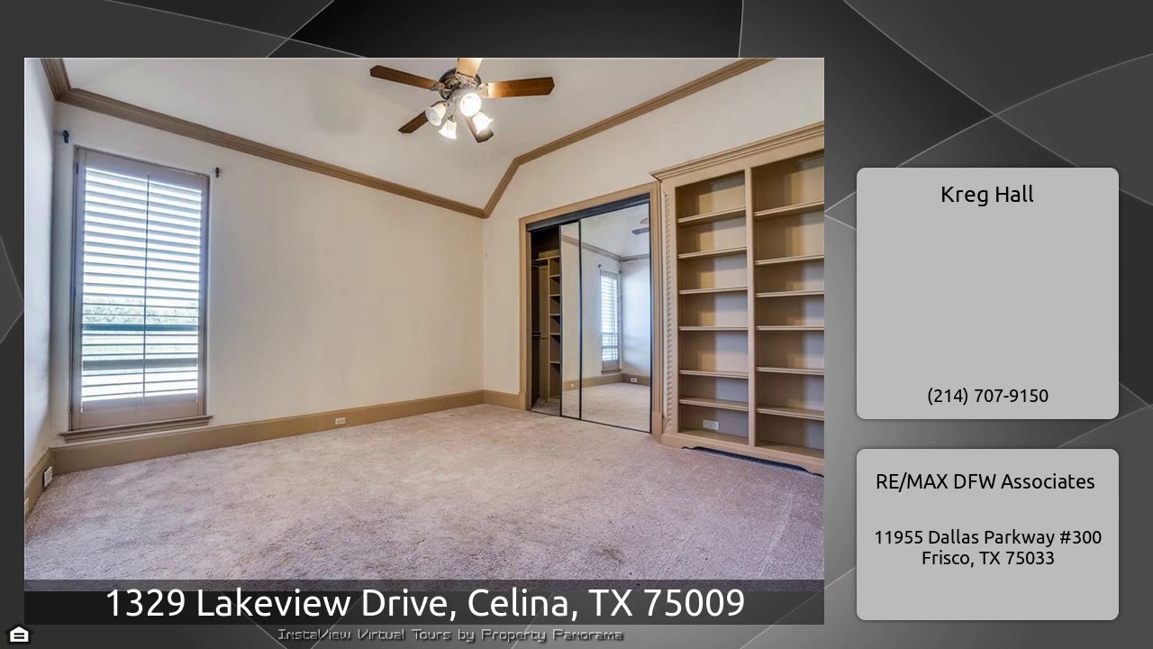 The Virtual Tour for the property at 1329 Lakeview Drive, Celina, TX 75009 listed for $550,000: Other homes for sale by Kreg Hall of RE/MAX DFW Associates: Morgan Lake Estates on 2 acres.Lg family room,floor to ceiling stone FP,entertainment center,wood floors,study with French doors,built in shelves,gun cabinet & WIC.Formal dining,wood floors & custom wood casings.Lg kitchen,granite,custom cabinets,island.Breakfast area,master down,bay window, plantation shutters,jet tub,marble counters,separate shower,lg WIC.BDR's 2 & 3 down,JNJ bath,crown molding,BDR 4 down,WIC,full bath with …